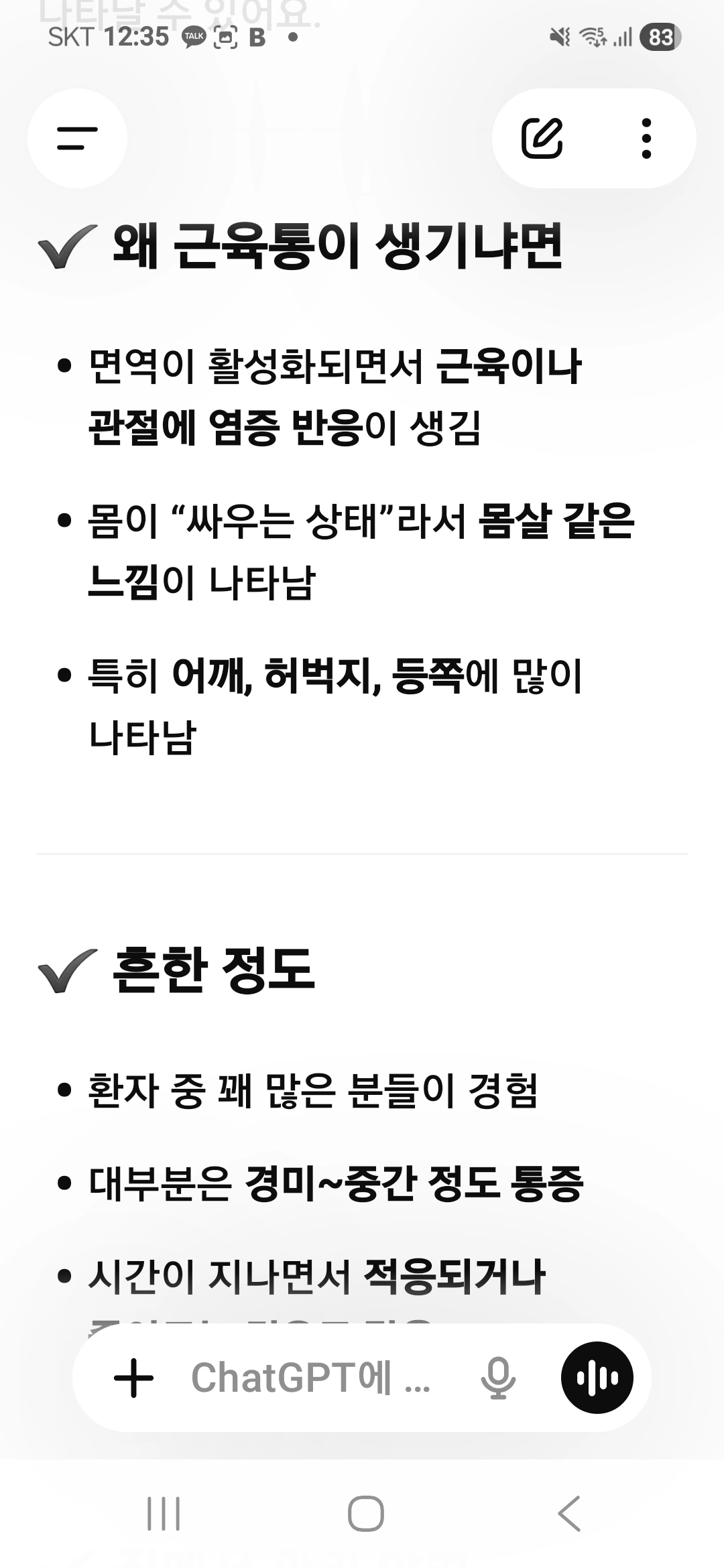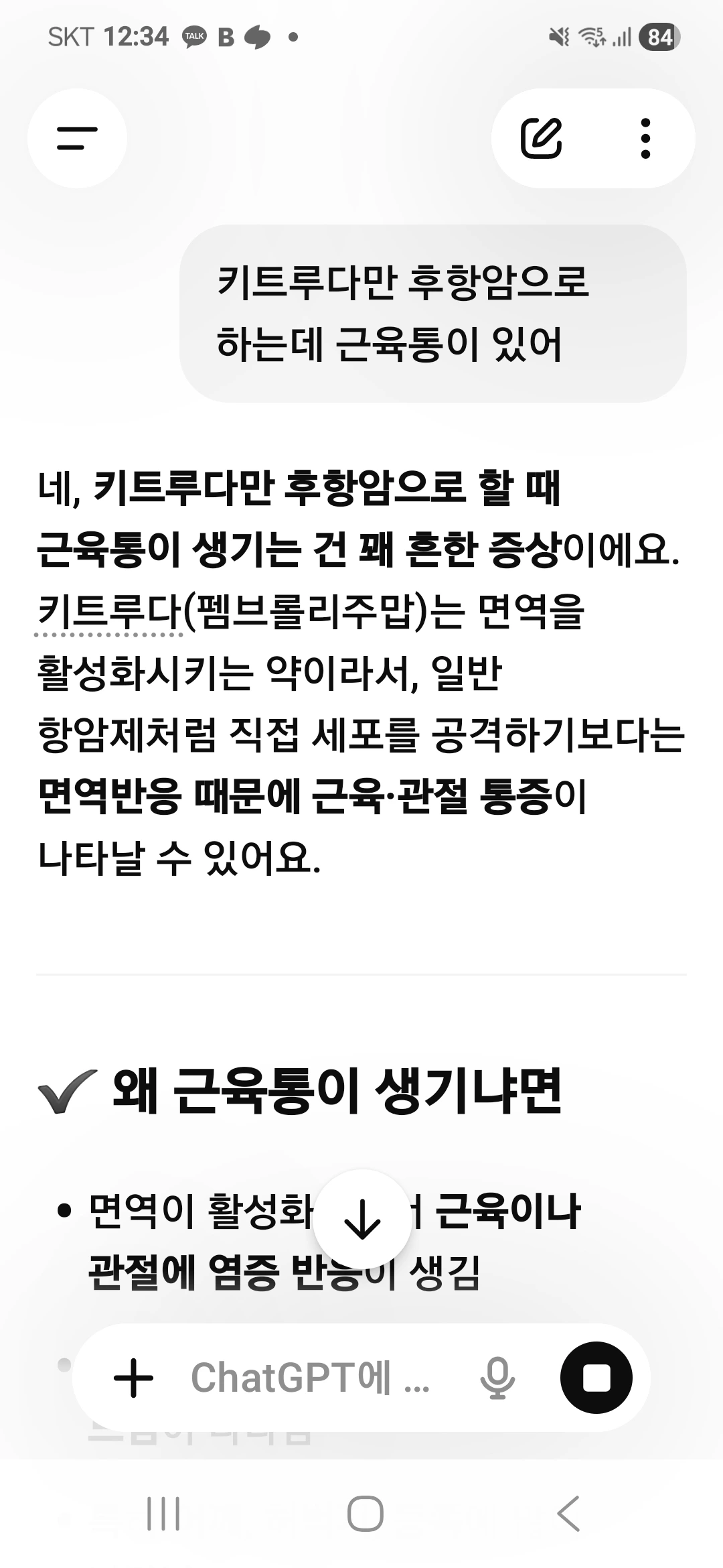오늘은 근육통이 넘 심해서 키트루다만 하는데 왜 아플까 챗gpt에 물음