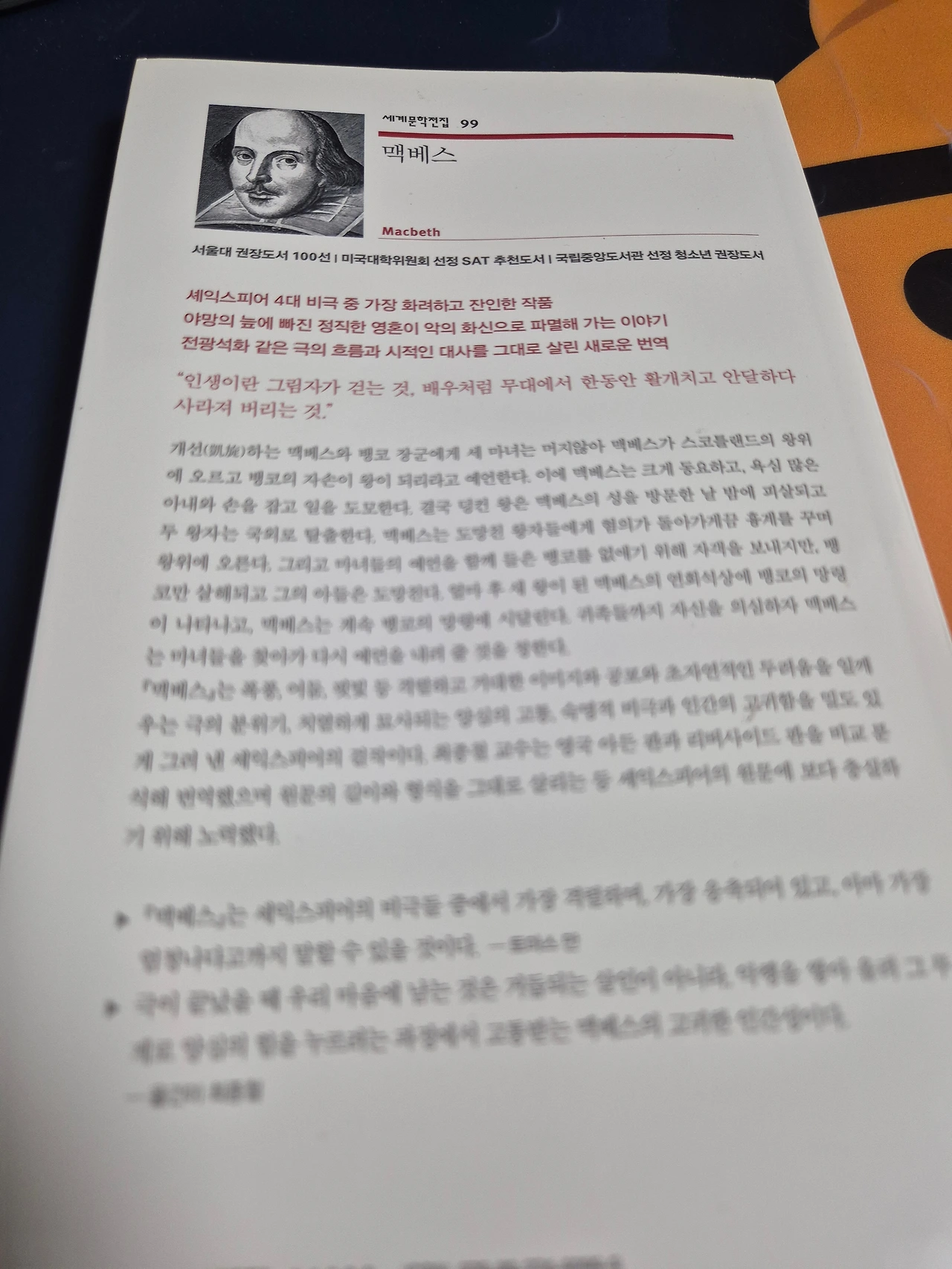 권력욕이 아무리 커도 보통의 인간이라면 법적, 도덕적 제약은 지키겠으나, 윤가나 멕베쓰나 다른 비극의 주인공들은 비정상적인 수단과 방법을 써서 목적을 달성해서 문제가 발생하는거겠지..이게 왜 셰익스피어의 비극인가 하면서 읽었는데 잘 다가오지 않는다. 그시절에는 나름 충격적인 스토리였을듯.(지금은 현실정치가 더 충격적 ㅋㅋㅋ)