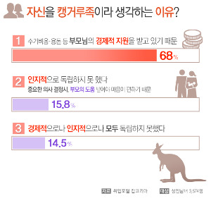 4. 하지만 이전 세대와는 다르게 자녀의 경제적 독립이 점차 지연되고 있습니다. 심지어 30대가 되어서도 부모 품에서 벗어나지 않으려는 '캥거루족'이 빠르게 늘고 있습니다. 대졸 이후에도 부모에게 주거를 의존하거나 생활비 등을 받아 쓰는 비율이 50%이상이라는 통계 결과도 있습니다.