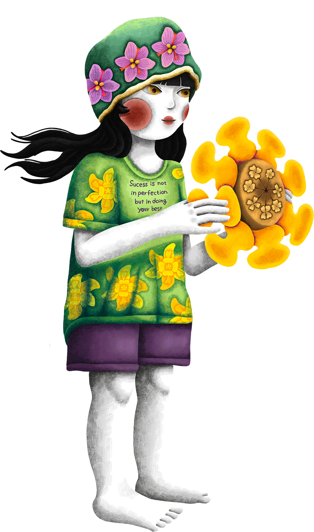해바라기는 태양을 향해 항상 최선을 다해 자라는 모습으로, "지속적인 노력"과 "끝없는 열정"을 상징합니다. 해바라기를 끌어안는 모습은 '최선이라는 결과'를 목표로 하는 아이의 결의를 의미합니다. (*해바라기 소망 시리즈 참조)