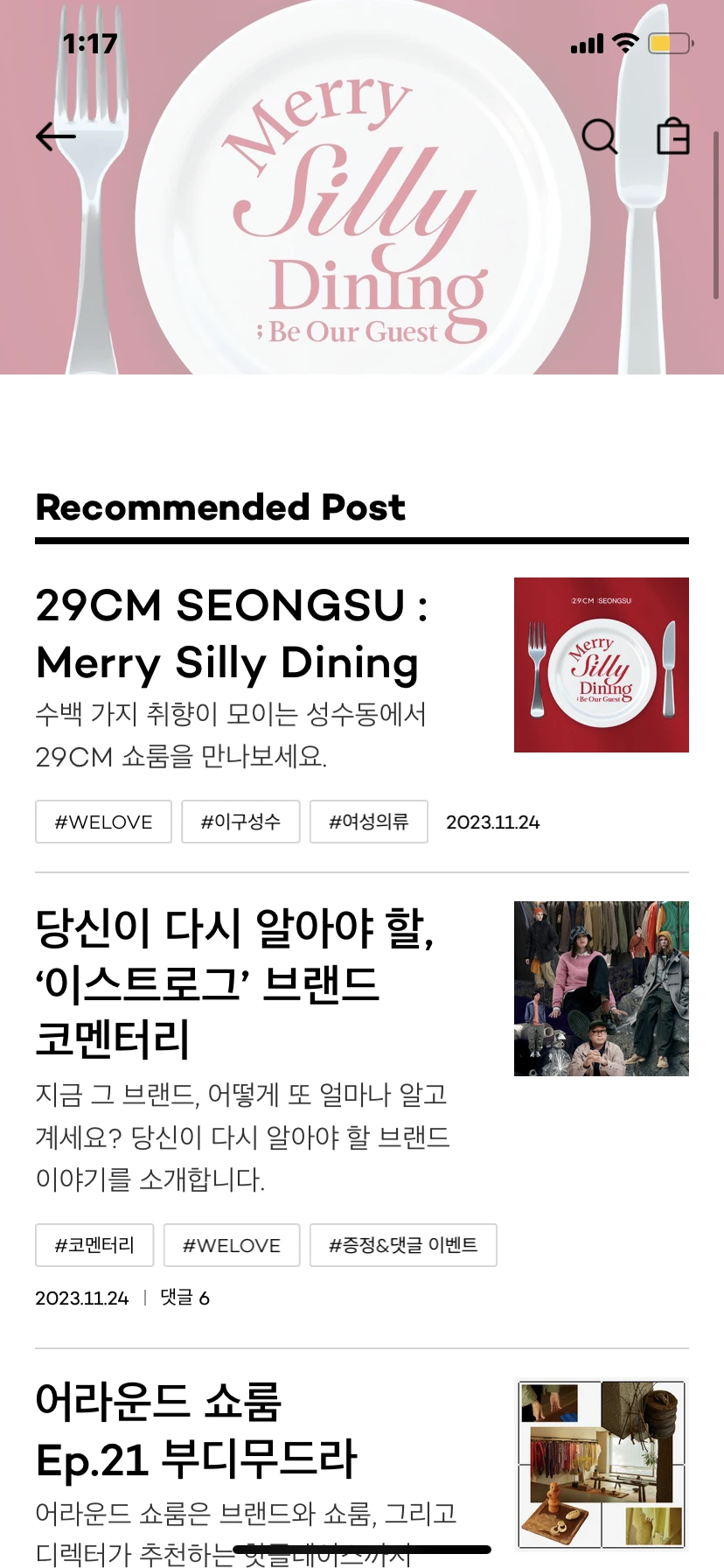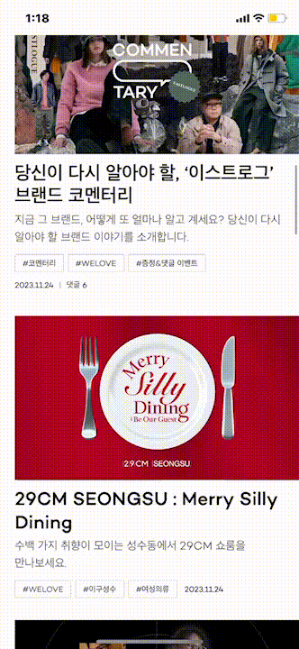 WELOVE를 들어가면 보이는 화면이다. 29CM는 "이거 좋은 건데 지금 할인해. 사봐" 하지 않는 것 같다. 대신, "이거 이런 브랜드인데, 정말 매력있지 않니?" 고객에게 이야기한다. 얕게 알았던 브랜드는 29CM를 통해 깊게 아는 브랜드가 된다. 상품이 더 매력적으로 보이고, 값이 비싸더라도 그럴만한 이유가 있구나 납득하게 된다. 사실 이런 정보만 보고, 가격 비교를 통한 타 플랫폼 구매를 하는 고객도 있겠지만 29CM는 매력적인 콘텐츠를 통해 고객이 꾸준히 유입될 수 있는 장을 마련한 것이라 생각한다.