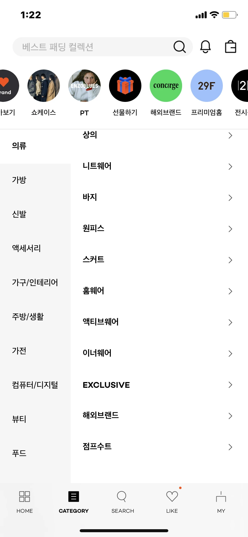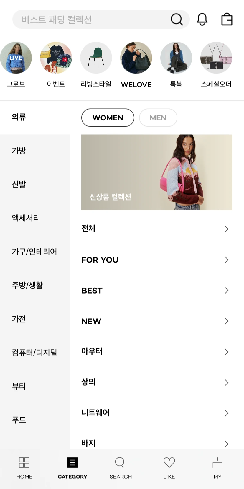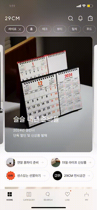 1. 카테고리를 위에서 슥슥- 쉽게 선택해서 상품을 볼 수 있다. 라이프 같은 경우, 라이프 카테고리 내 세부 카테고리를 선택해 카테고리별 상품을 구경할 수 있다. 카테고리 UI 은근 머리 아픔 ㅠ_ㅠ
