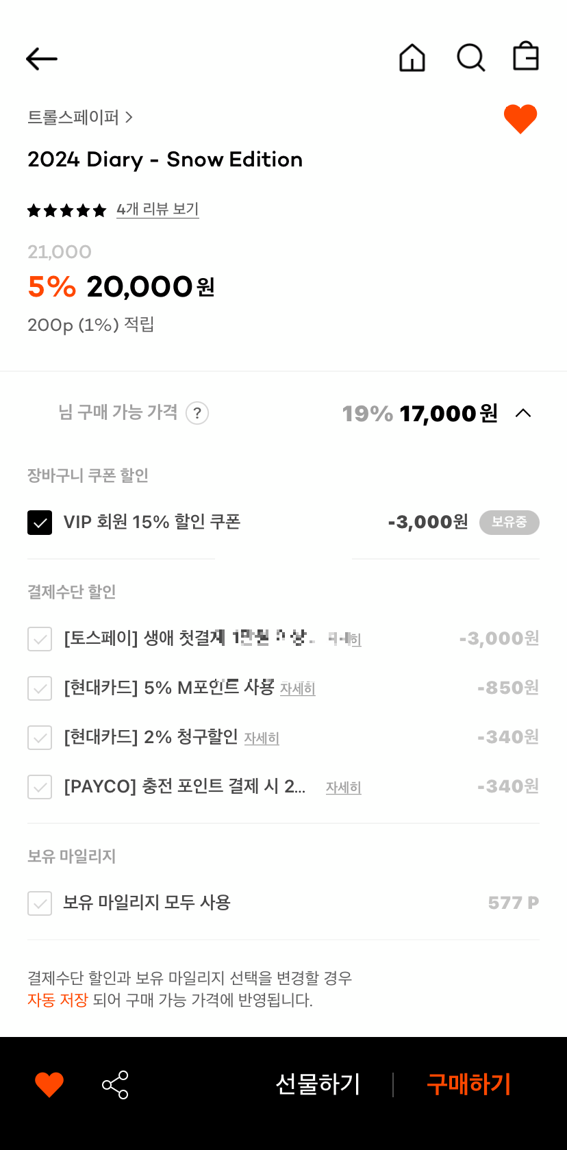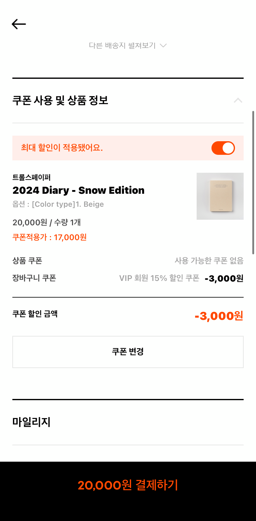 이제 너무 흔한 기능 중 하나가 되었지만, 29CM는 타 사이트와 다르게 훼이크를 하지 않는다. (__% 할인이래놓고 카드사 할인인 훼이크 말하는 거임) 결제 전 카드사 혜택을 제외한 가장 저렴한 가격을 디폴트로 보여주고, 카드사 혜택을 통한 할인을 옵션으로 보여준다. 마일리지 사용도 디폴트가 아니다!