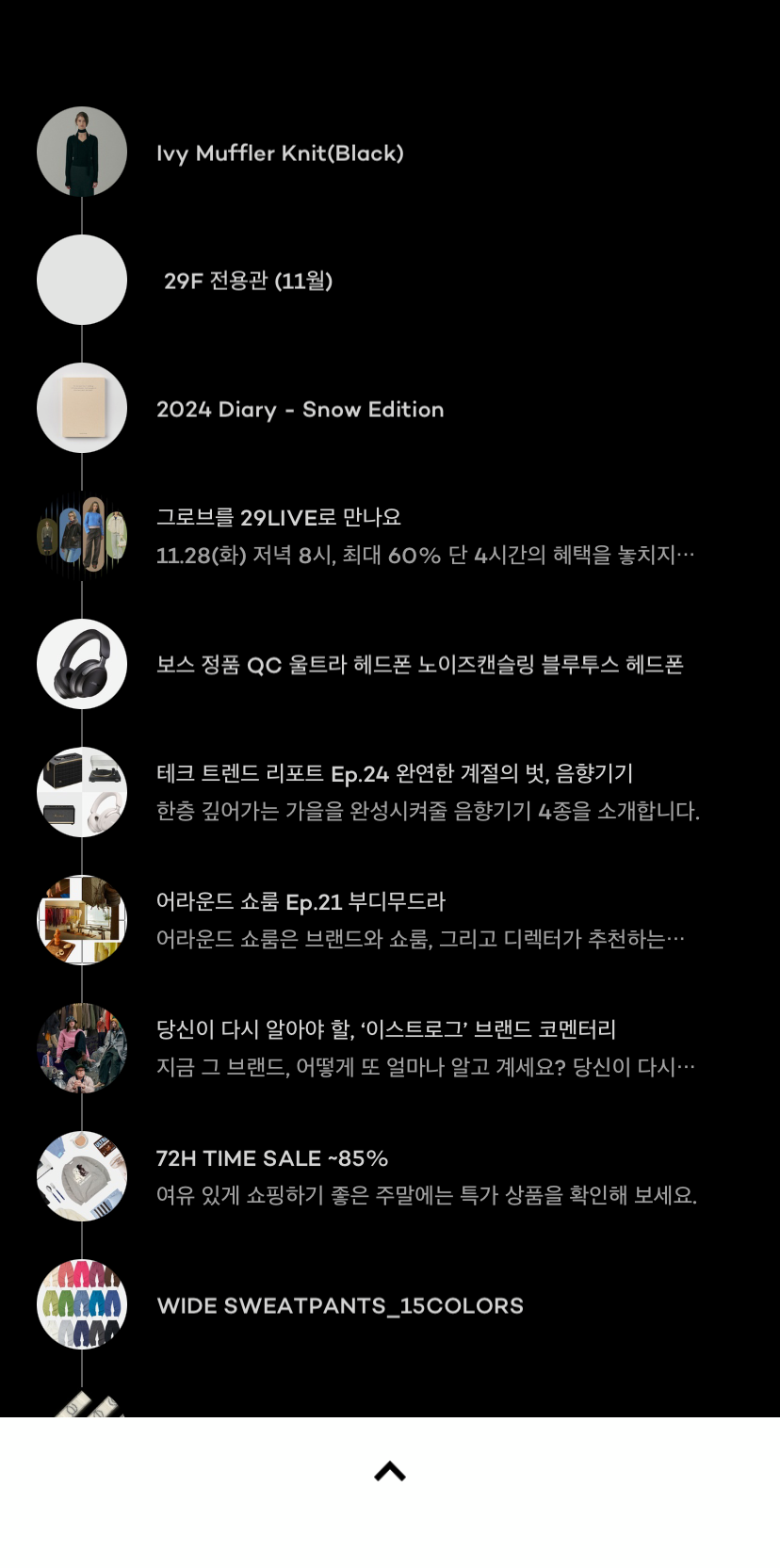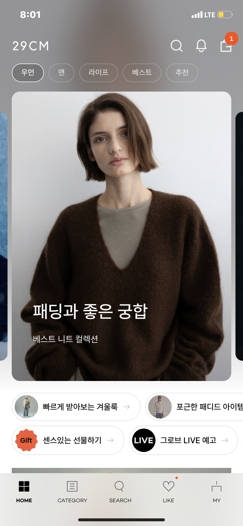 메인 홈 화면이다. 29CM는 큰 이미지와 비교적 짧은 글이 혼합된 형태로 상품을 표현한다. 근데 저 짧은 글을 29CM가 참 잘하는 것 같다. 패딩에 어울리는 니트 고민 한 번쯤 해 본 사람이라면, 클릭할 수 밖에 없다.