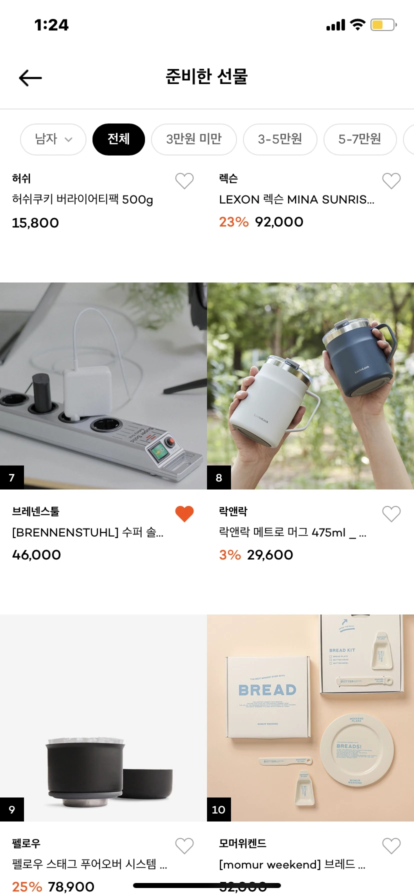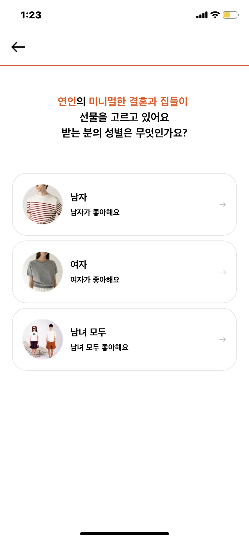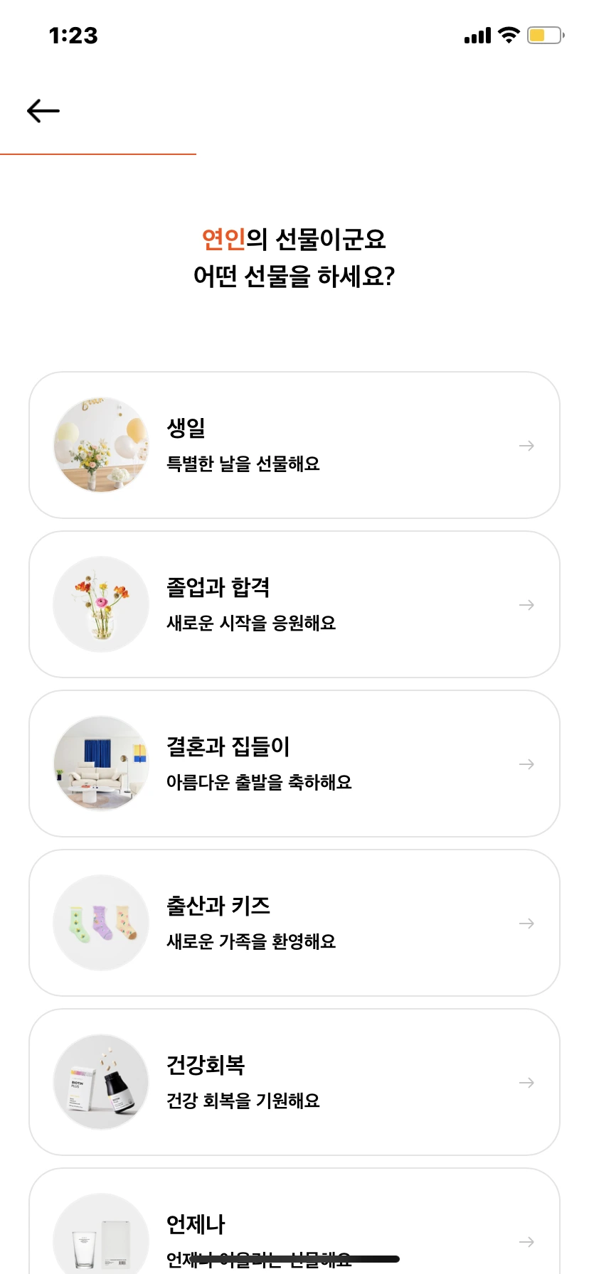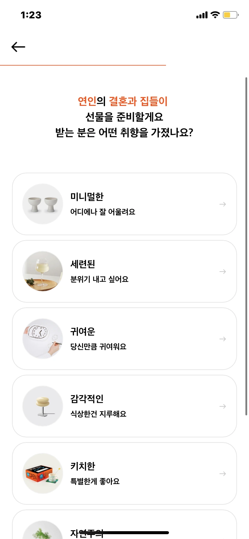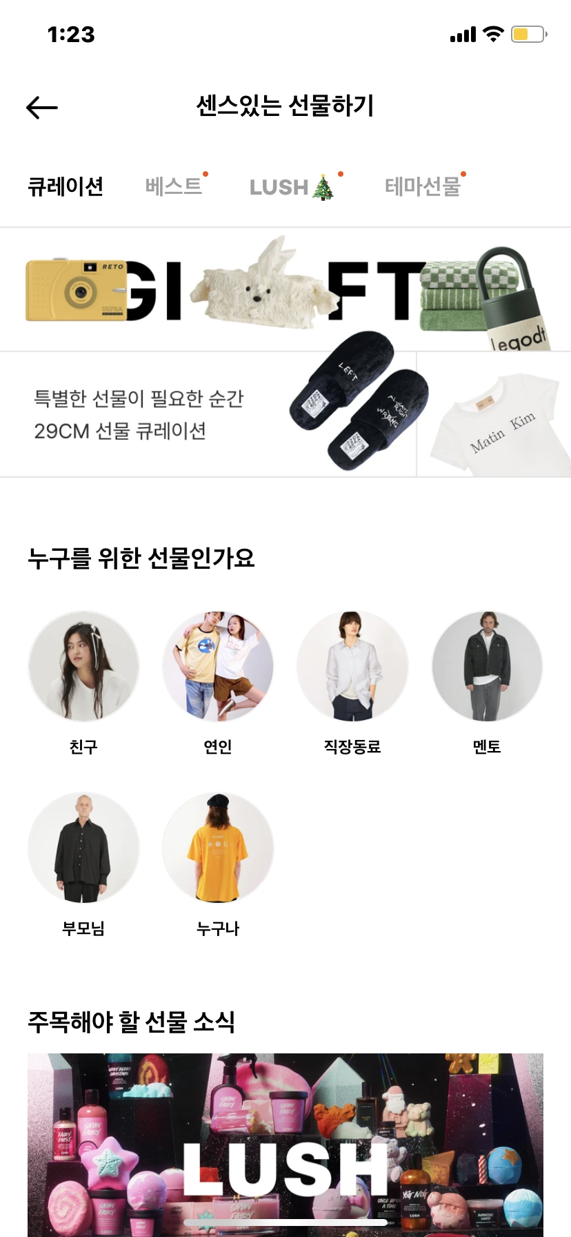 선물하기 카테고리를 들어가면 보이는 화면들이다. 나 같은 경우, 친한 지인 선물할 때 본인이 원하는 게 없다고 하면 29CM를 굉장히 많이 들여다 본다. 하지만, 선물 고르기란 정말 어려운 일! 29CM의 선물 쇼핑 여정에 난 꽤 많은 감동을 받았다. 이 자식 정말 떠먹여주는 서비스구나.. 선물의 대상, 선물의 목적, 대상의 (대략적) 취향, 대상의 성별만 입력하면 가격대별 선물을 알아서 보여주니! 선물 고르기가 매우 쉬워지고, 결제도 매우 쉬워진다 (^^)