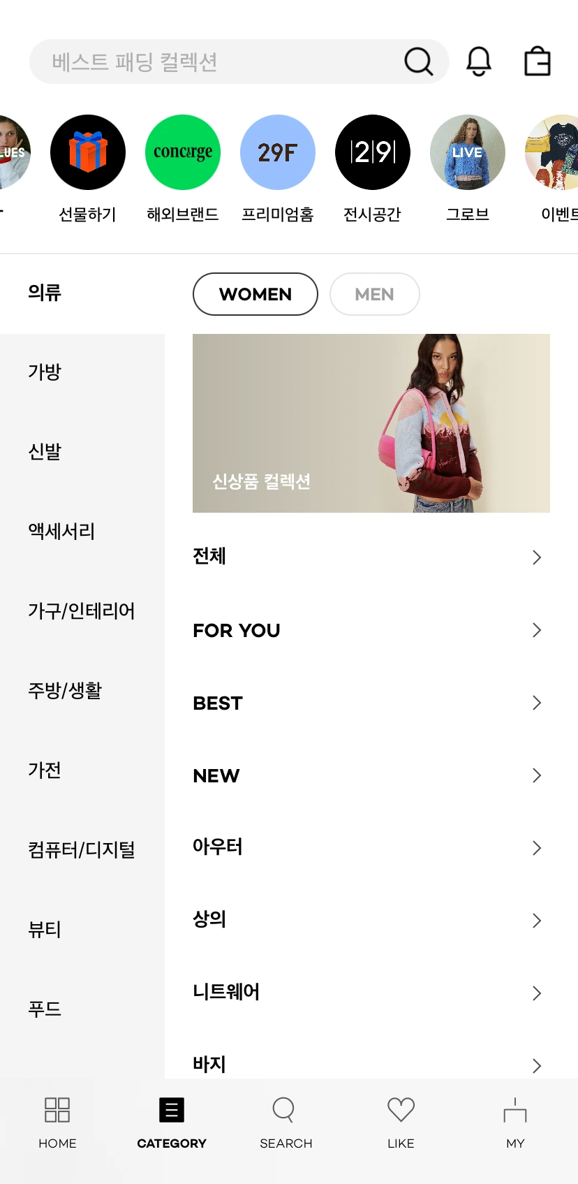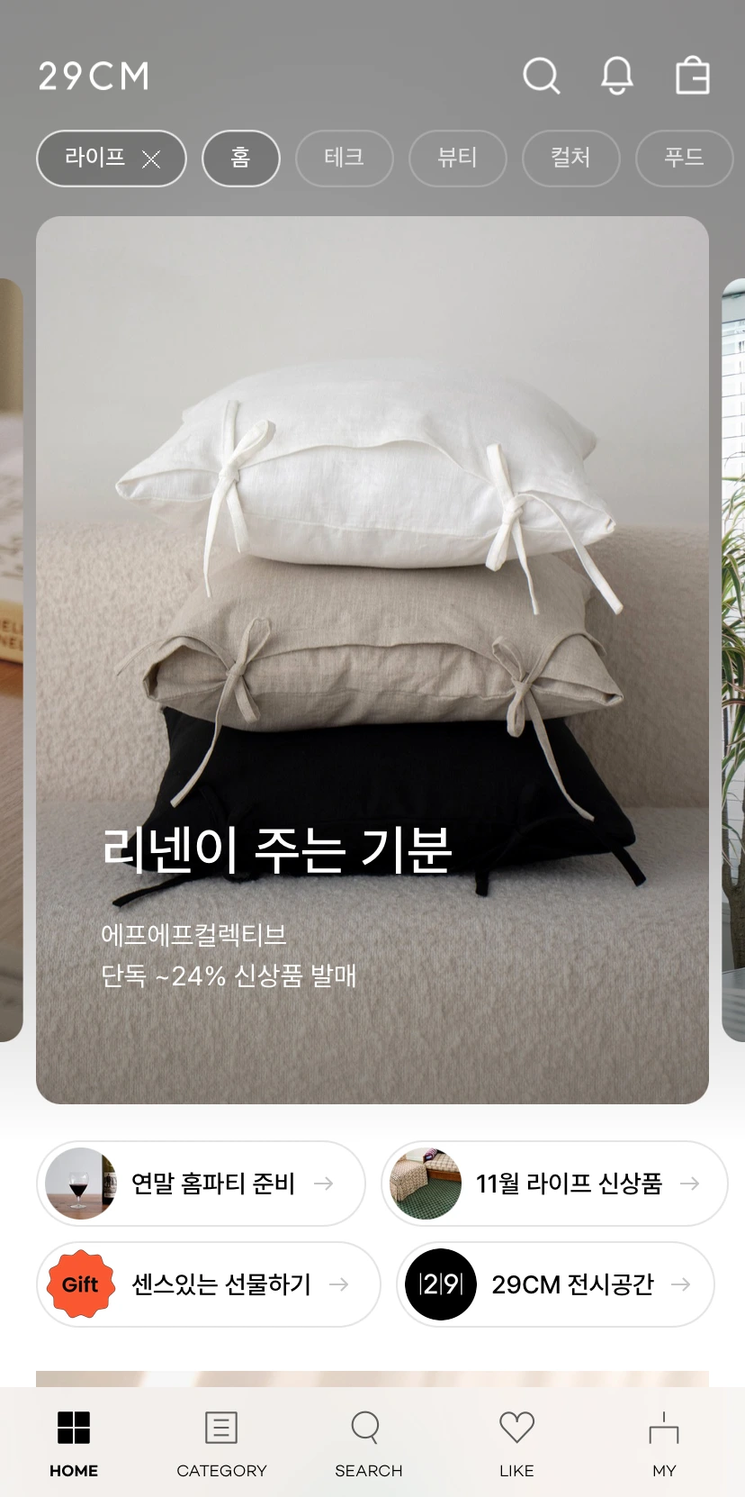 29F 프리미엄 홈을 들어가면 보이는 화면이다. 매력적인 콘텐츠로 나의 마음을 사로잡은 29CM가 감각으로 엄선했다고 하니 또 보게 된다. 나의 경우 사진 않는 상품들이 전부지만, '예쁘다' 하며 상품을 보고 있긴 하다.