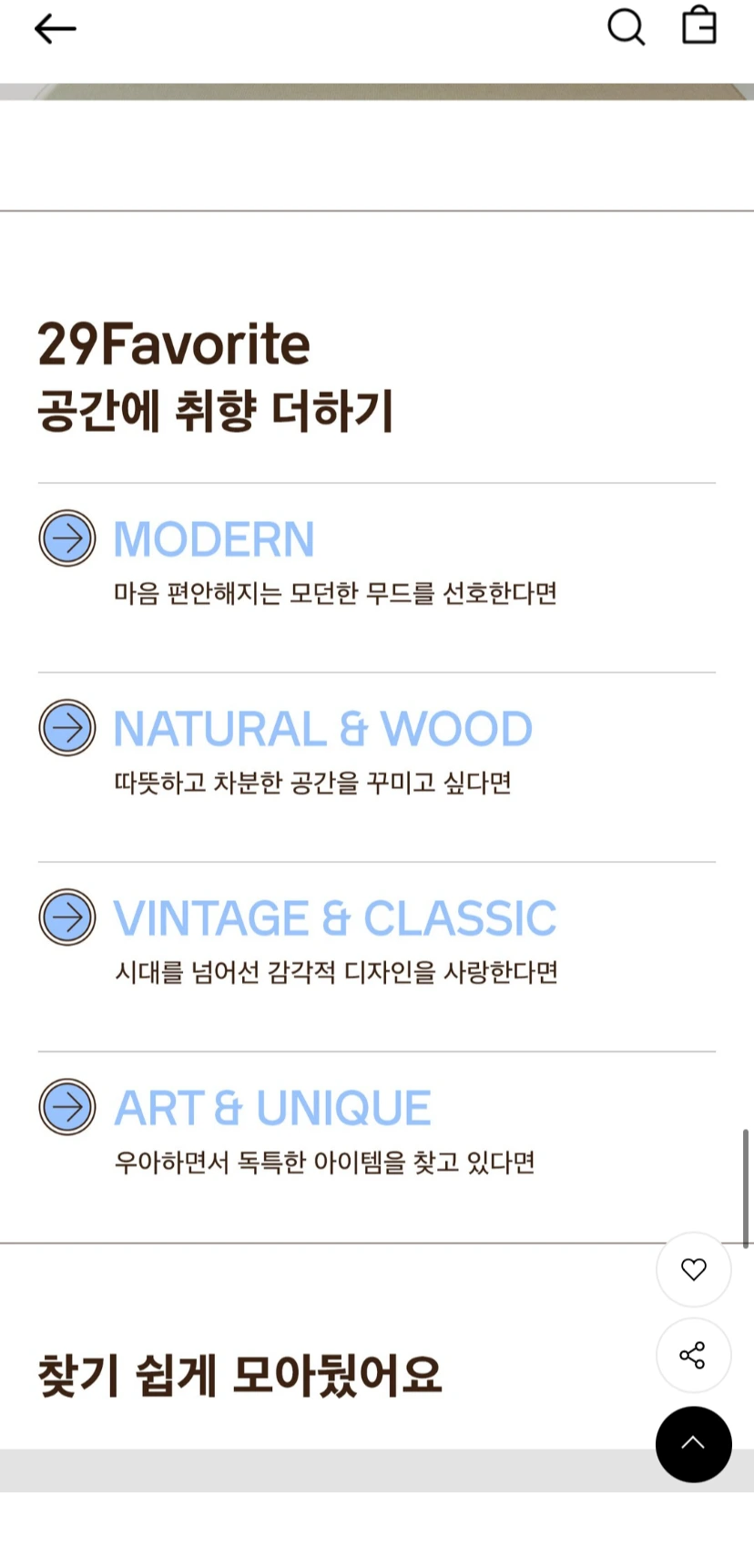 더불어, 선택을 도와주는 저 한 줄 멘트들도 좋다. 모던이 뭐고, 내츄럴 앤 우드가 뭔데(?) 하는 나 같은 사람에게 제격이다. 서비스는 고객에게 뭐든 떠먹여줘야한다(!)