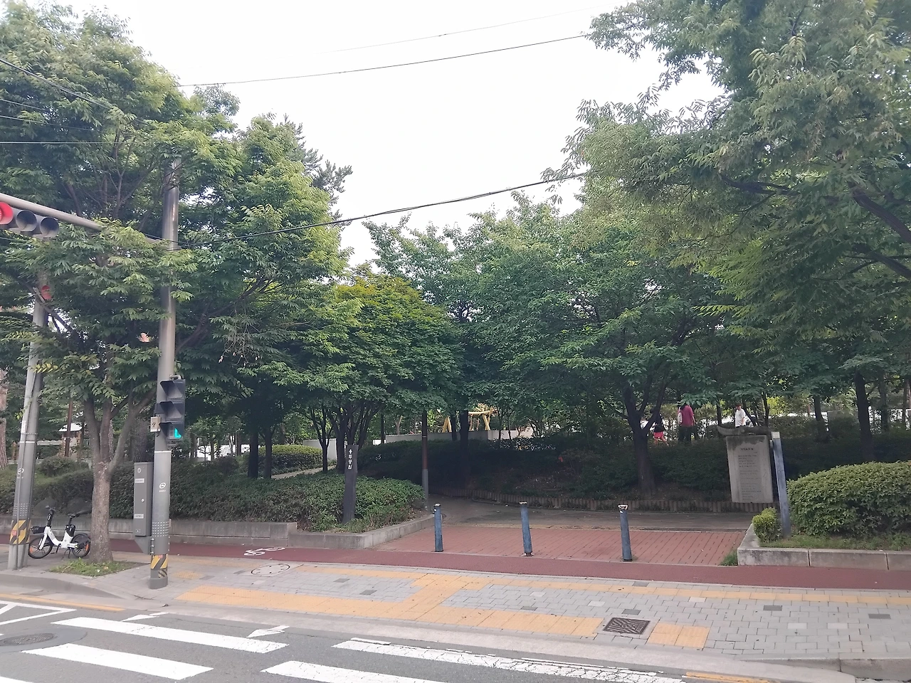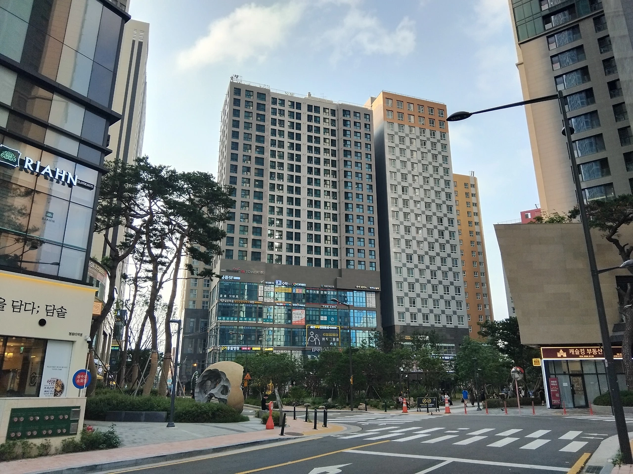 더 걸어서 대로변을 건너면 롯데캐슬 아파트단지가 들어서고 곧 삼각형의 공개공지가 나타난다. 이곳엔 아파트주민뿐만 아니라 다양한 사람들이 모여 시간을 보내고 있다. 지금까지 본 도시공간 중에서 가장 사회적인 공간이라는 생각이 들었다. 확실히 담벼락과 옹벽으로 막혀있는 예전의 나 홀로 아파트단지와 달랐다. 내가 떠나 있던 시간 동안 한국의 아파트건축이 달라졌다는 걸 느꼈다. 비둘기가 많다는 것만 빼면 확실히 머물기에 쾌적한 도시공간이다.