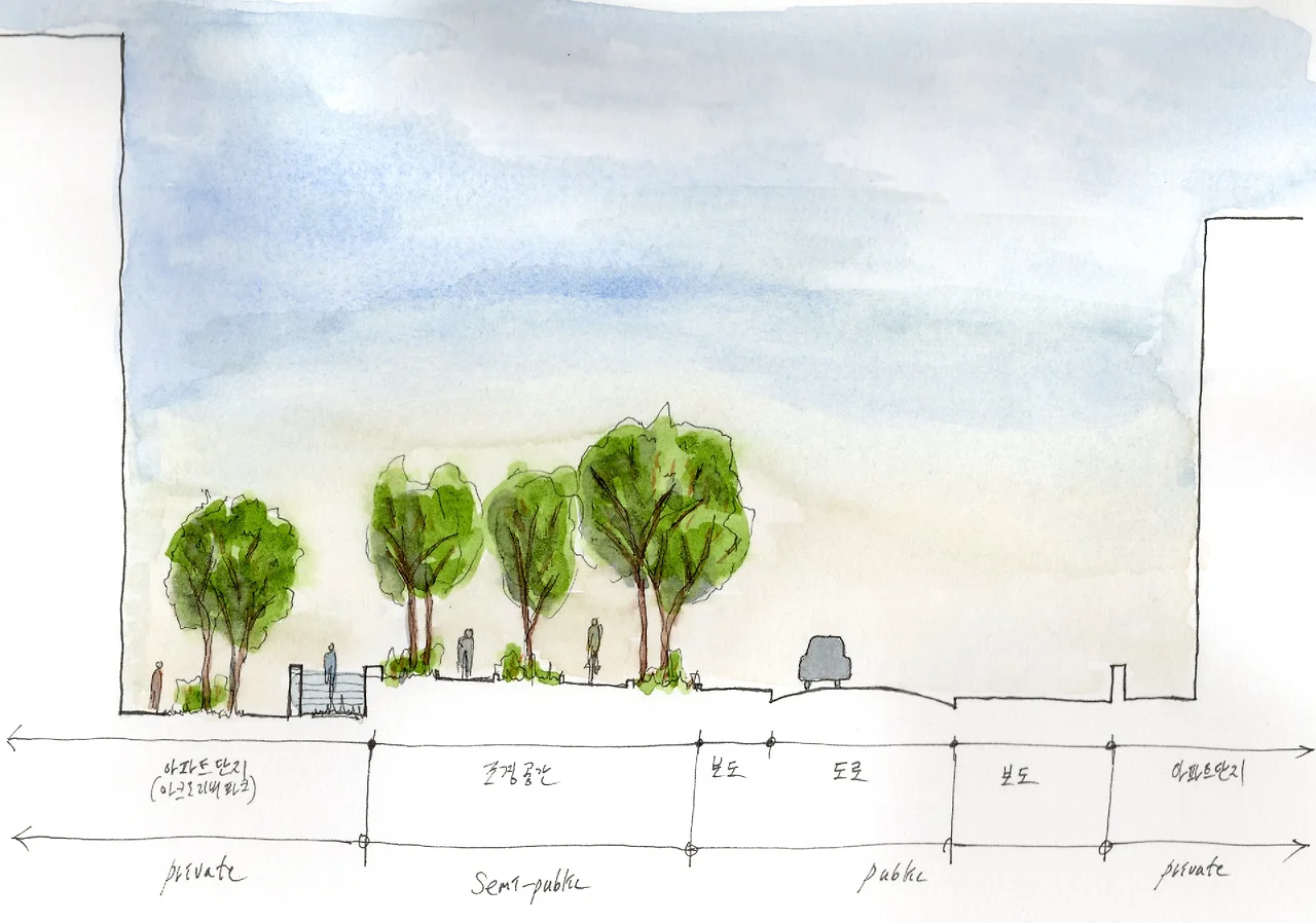 기단 얘기를 더하면, 예전아파트는 건물의 타입과 층수에 상관없이 모든 동에 같은 높이의 기단을 부여해서 마치 키 큰아이와 작은아이가 같은 사이즈의 바지를 입고 돌아다니는 느낌이었다. 이곳에서는 각 건물은 타입과 층수에 따라 각자 다른 높이의 기단을 갖고 있다. 판상형은 2-3개 층, 탑상형은 5-6개 층으로 각기 다른 높이의 기단이 존재한다. 마침내 아파트건축이 무표정한 단지건축에서 벗어나 각 건물에 그만의 특징을 갖게 된 것이다.