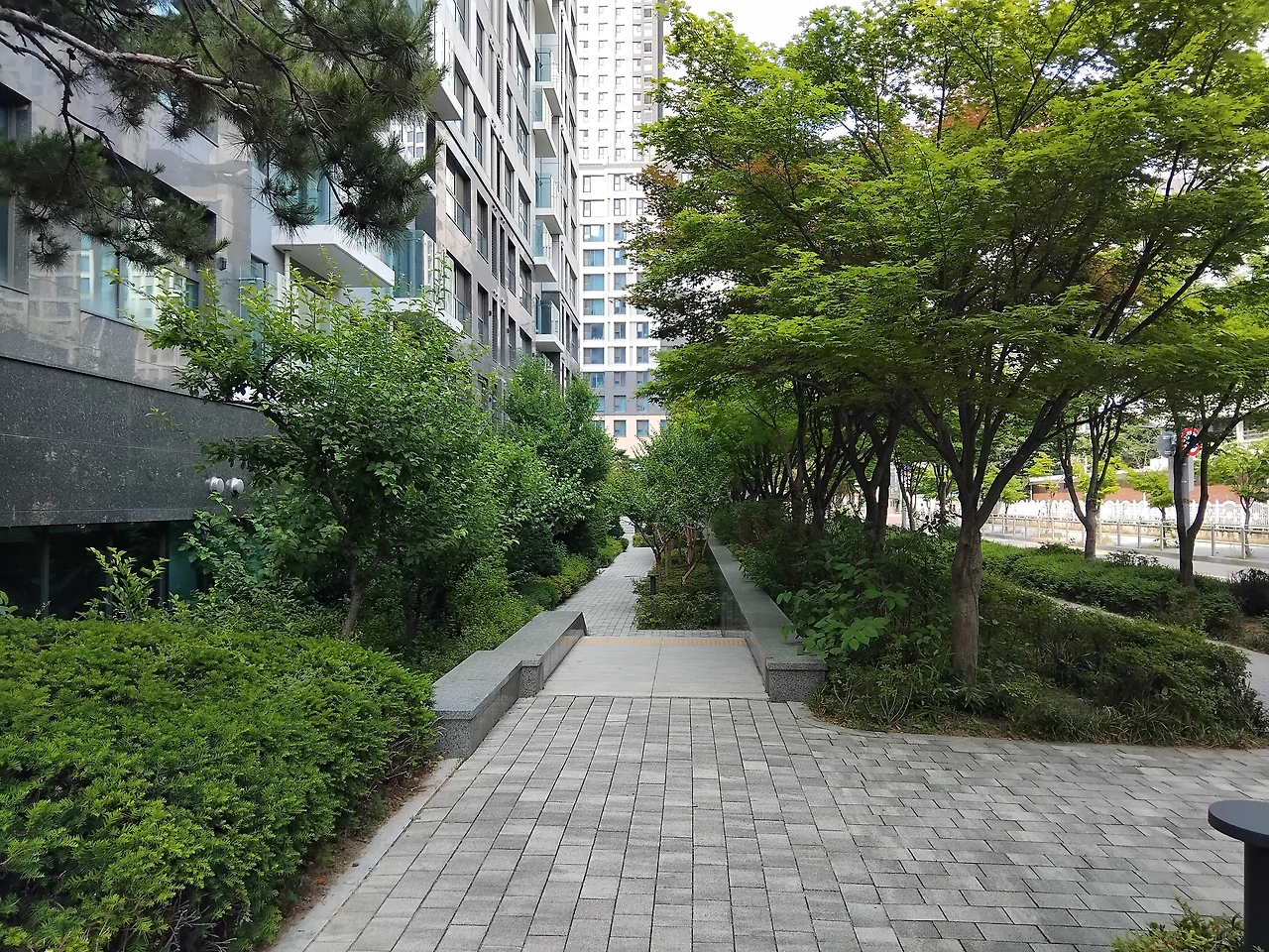 오솔길을 따라 걷다 중앙정원으로 들어가는 계단으로 진입했다. 그러면서 나도 모르게 와 했다. 가까이에 숲이 기다리고 있었기 때문이다. 중정은 지금까지 봐왔던 아파트고층에서 내다뵈지는 서있기 뻘쭘한 허허벌판이 아닌, 포근한 작은 숲이었다. 크기도 아담하게 적당했다. 여기서 사색을 하거나 이웃과 담소를 나누는 게 자연스럽게 상상됐다.