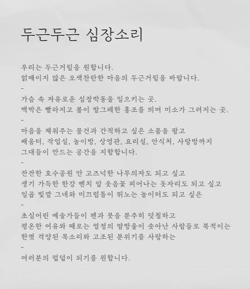 럽덥은 청진기를 통해서 들리는 두근거림을 뜻해요. 심장 판막이 딱-하고 닫힐 때 내는 소리로 만들어지죠. 그렇게 공간 이름 '럽덥'을 운명처럼 만났어요.