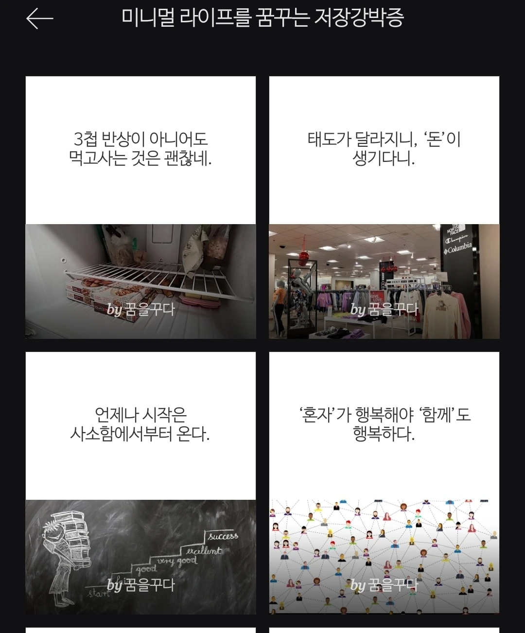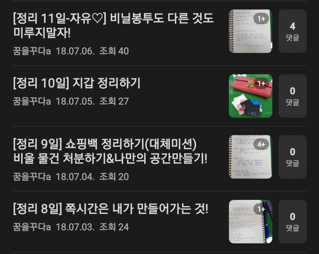 미니멀 라이프를 꿈꾸는 저장강박증이라는 제목으로 첫 글을 쓸 때만 해도 이걸 쓴다고 해서 뭐가 달라질까 반신반의했다. 그저 매일 글을 쓴다는 점에 의의를 두기로 하고 글도 간단히 작성했다. 그런데 미니멀 라이프를 생각하며 글을 쓰다 보니 일상을 구체적으로 돌아보게 됐다. 자아, 육아, 집안일, 인간관계 등 나를 둘러싸고 있는 모든 것을 과거에 대한 후회와 반성, 현재의 노력과 생각, 미래에 꿈꾸는 일상과 목표 측면에서 적어보았다. 적으면 적을수록 변화가 필요한 부분, 그 이유, 대책 등이 눈에 들어왔다. 글을 쓰기 위해 미니멀 라이프와 관련된 생각을 늘 하게 되고, 떠오르는 생각을 바로 실천까지 옮겼다. 혼자만의 다짐이 아니라 다른 사람에게 도전 중이라는 사실을 글로 쓰고 있다는 게 동기부여가 되기도 했다.