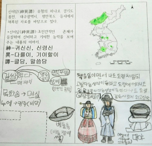 우리나라에 어떤 신들의 이야기가 있는지 간단히 설명한 뒤 <손 없는 색시>가 구전되어 온 지역, 용인과 대구, 평북지역을 지도에서 찾아 표시해 보았다.