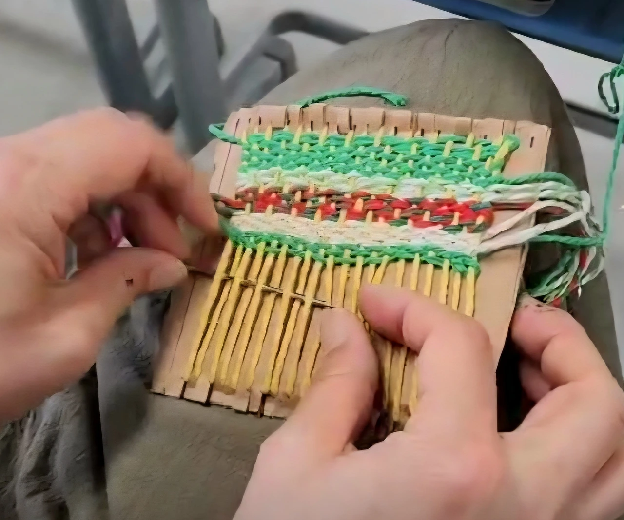 미니 베짜기를 어린이들과 하고싶어서 시험삼아 골판지와 실을 이용해 베를 짜 봤다. 어린이들에게는 내가 만든 걸 보여주기만 했다.