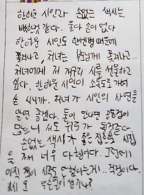 어린이들에게 시인의 사연과 함께 시를 알알려주었는데 기억에 남았나 보다. 여러 명의 어린이가 한하운의 개구리를 색시에게 선물하고 싶어 했다.