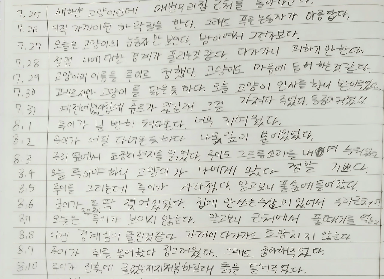 다*이는 낮에도 밤에도 고양이를 관찰한 듯하다. 푸른 눈동자가 아름답다는 표현에서 다*이가 고양이에게 가까이 다가가려고 애쓰는 마음이 느껴진다. 다*이는 이름도 '루이'로 정하고 인사도 하고 츄르도 가져다준다. 그렇게 천천히 다가가고 있다. 다*이 글을 읽으면서 동화책을 읽는 기분이 들었다.