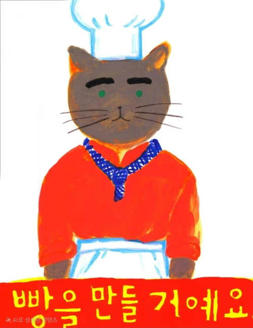 주인공 고양이는 아무렇지도 않게 독자에게 말을 건다. 잘 아는 사이처럼, 늘 해오던 일을 하는 거처럼 친근하게 군다. 옷차림을 보아하니 초록 눈 고양이는 꽤나 능숙하게 빵을 만들 것으로 보인다. 글씨체에서는 사뭇 다른 느낌을 준다. 지금까지는 일로 빵을 했는데 오늘은 취미로 한다는 점을, 빼뚤 한 글씨를 통해 은근이 내비치는 거 같다.