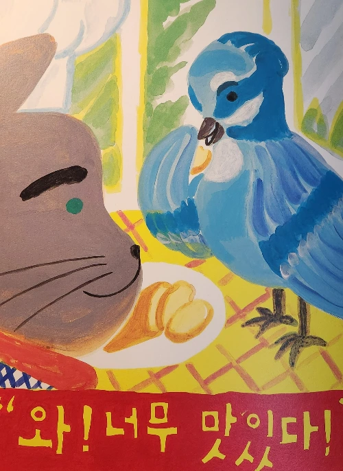 어쨌든 모두 기분이 좋다. 빵 만드는 시간이라 그렇다. 빨강과 노랑, 갈색만 써서 큼직하게 펼 친 면에서 반죽하는 장면은 실감을 느끼게 하는 감각 있는 표현이다. 우리 이미 침을 꼴깍 삼키는 중이다. 드디어 오븐에 넣고 빵을 굽는 시간이다. 드디어 빵이 나왔다. 빵 색깔은 갓구운 빵이 내 앞에 있는 거처럼 실감있는 색채를 하고 있었다.