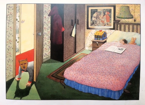 더 살펴보자. 침대 밑 왼쪽에는 무슨 줄 같기도 하고 꼬리 같기도 한 게 삐져나와 있다. 오른편에는 신발 한 켤레가 뒤집어 진채 나와 있다. 어디서 본 모양이다. 로즈가 터널로 들어갈 때 신었던 그 신발이다. 이 불안하고 고요한 밤에 오빠가 슬금슬금 로즈 방으로 들어온다. 늑대 가면을 쓰고서 말이다.