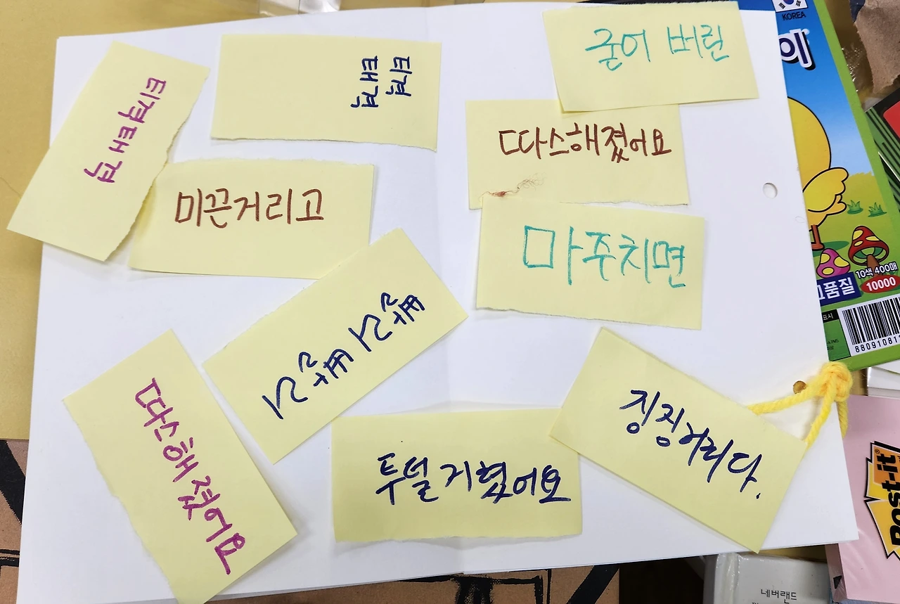 춤으로 표현해보는 건 어떨까. 그림책에서 인상깊은 형용사나 동사를 두개씩 뽑는다. 카드에 낱말을 쓰고 한데 모은뒤 다른 사람이 적은 낱말을 하나씩 고른다.