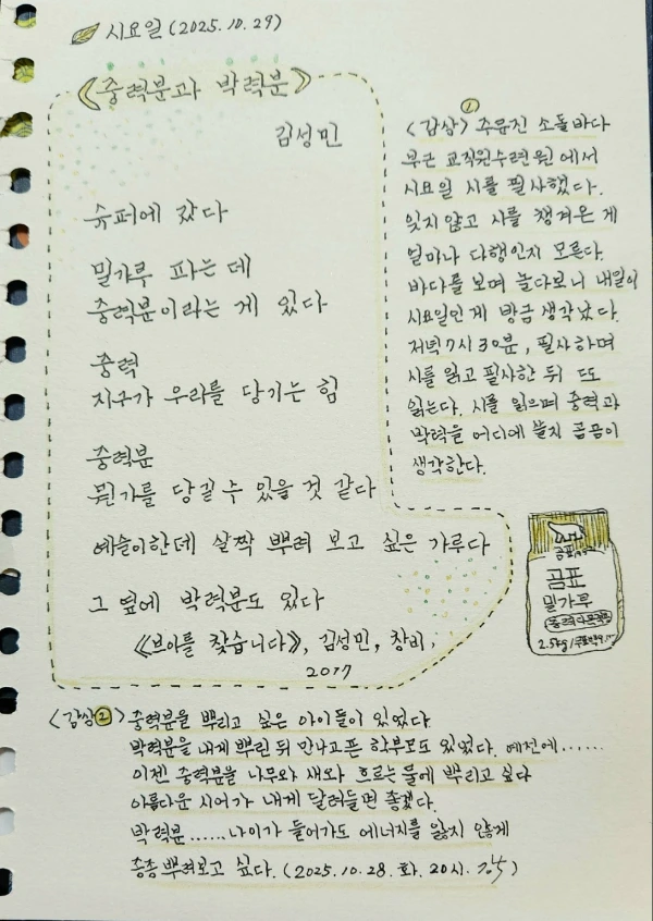 여행을 가게 되었다. 2년간 근무했던 주문진으로 가는 2박 3일 여행이다. 챙길 물건도 많지만 빼뜨릴 수 없는 게 있었다. 바로 수요일에 지인들에게 전송할 시 필사 재료다. 다행히 주말에 시를 골라놓았다. 김성민 시인의 <브이를 찾습니다>에서 고른 시, '중력분, 박력분'이다.