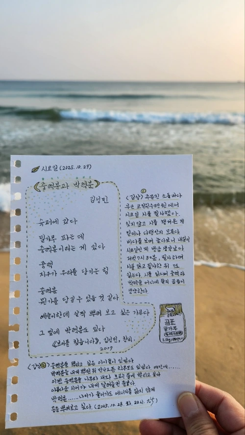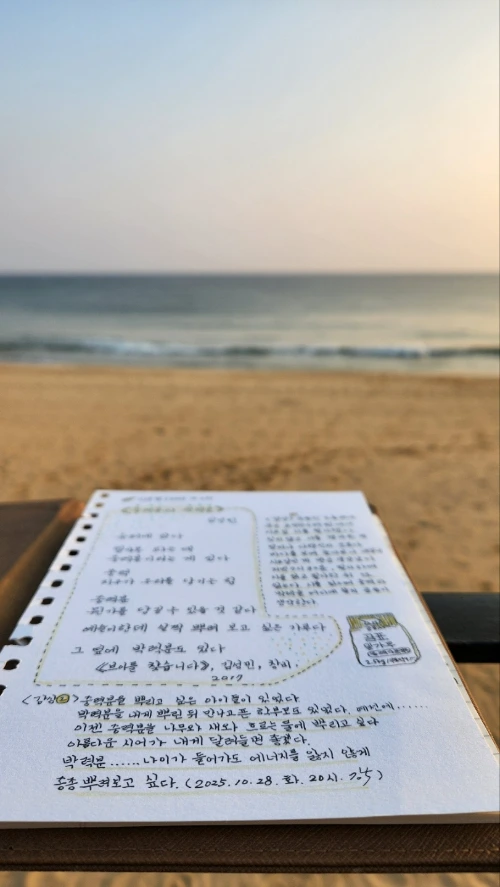 수요일 아침, 필사한 종이를 가지고 바다로 나갔다. 파도 소리와 해의 기운과 갈매기의 노래를 담아 사진을 찍었다. 그리고 전송을 했다.