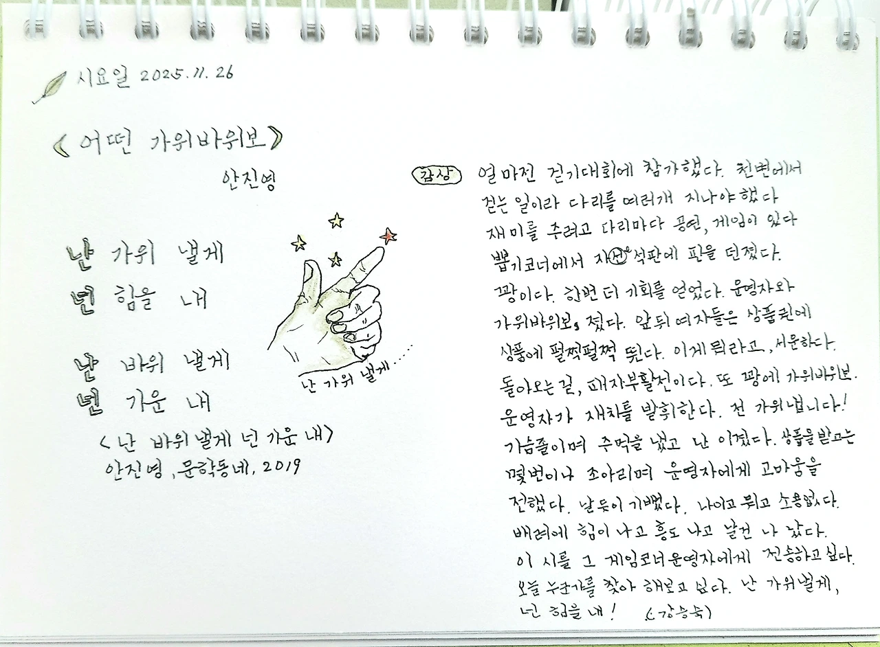 이 시를 그 게임 코너 운영자에게 전송하고 싶다. 나도 누군가를 위해 이런 가위바위보를 해야겠다.
