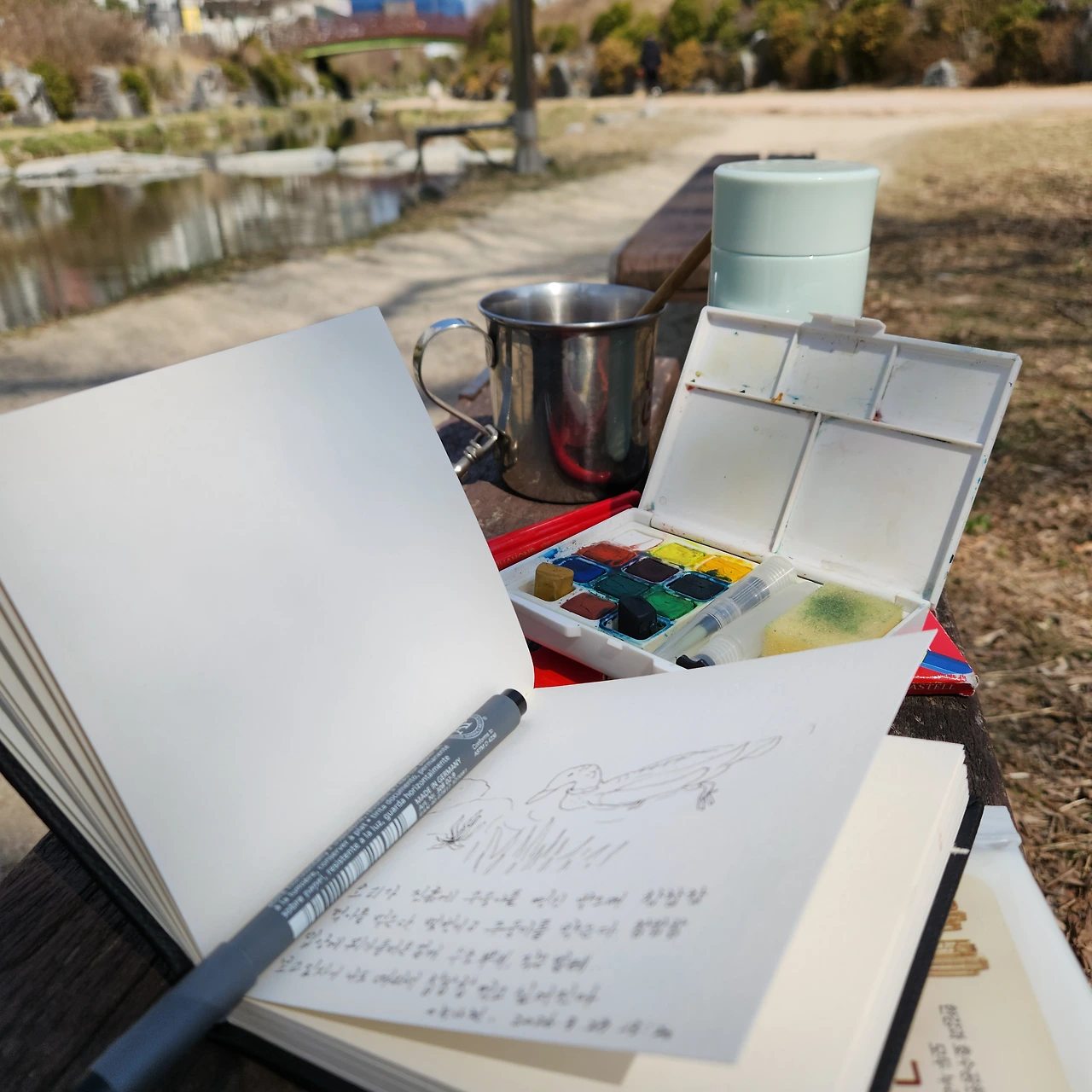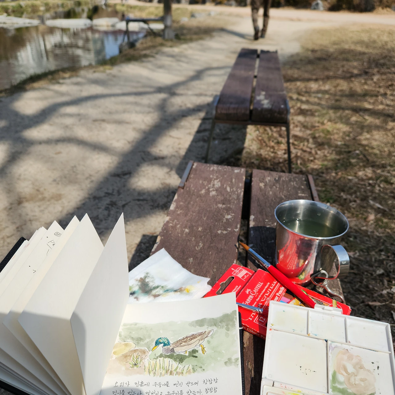 버드나무 아래 의자에 앉아 주섬주섬 수첩과 물감을 꺼냈다. 스텐컵을 들고 개천 돌징검다리로 갔다. 천천히 물을 떴다. 누군가 보아주길 바랄만큼 물 뜨는 몸짓이 내 마음에도 들었다. 오리는 한자리에 있지 않을테니 사진부터 찍어두었다.