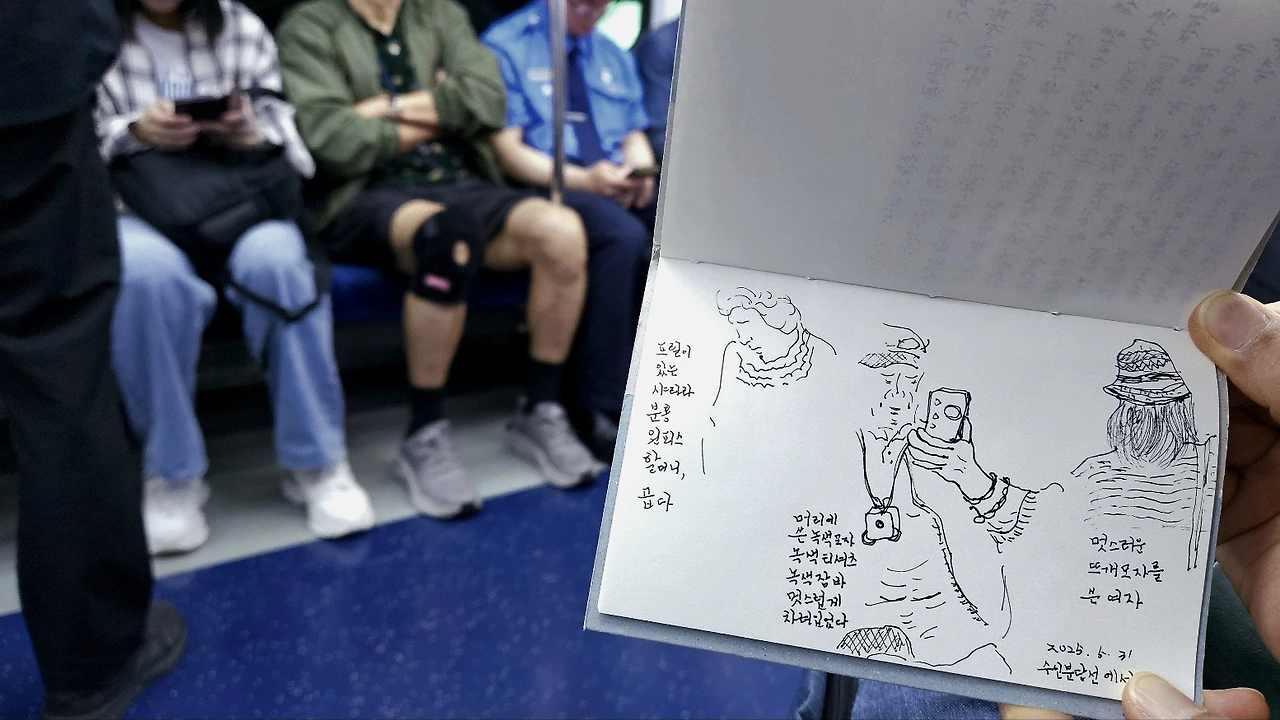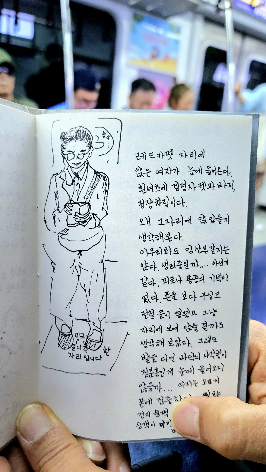 그냥 눈앞에 보이는 것을 적어나갔다. 시간이 지나면서 비어있던 전철 좌석이 하나 둘 채워졌다. 통로에 사람이 들어서면 그림 그리는 일이 어려워질 듯하여 그림부터 그리기로 했다.