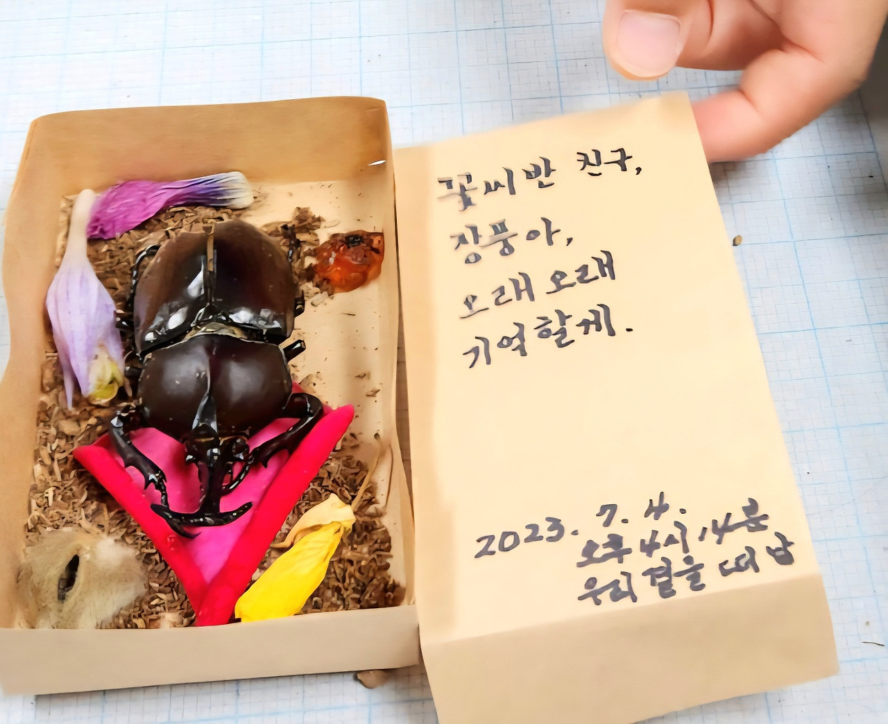 다음 날 아침, 등교한 어린이들은 돌아가며 장풍이 등과 머리를 쓰다듬었다. 그리고 어린이들이 종이 상자로 만든 작은 상자 안에 장풍이를 넣었다. 이를테면 관이었다. 추억 편지도 넣고 대추와 꽃잎도 넣었다. 장풍이는 교실 사육상자에서 우리 반 '꽃씨' 어린이 친구들과 놀아주었다. 그리고 시간이 흘러 숨이 멈추었다. 그 작은 곤충이 사랑을 하고 알을 낳고 열심히 살다 갔다.