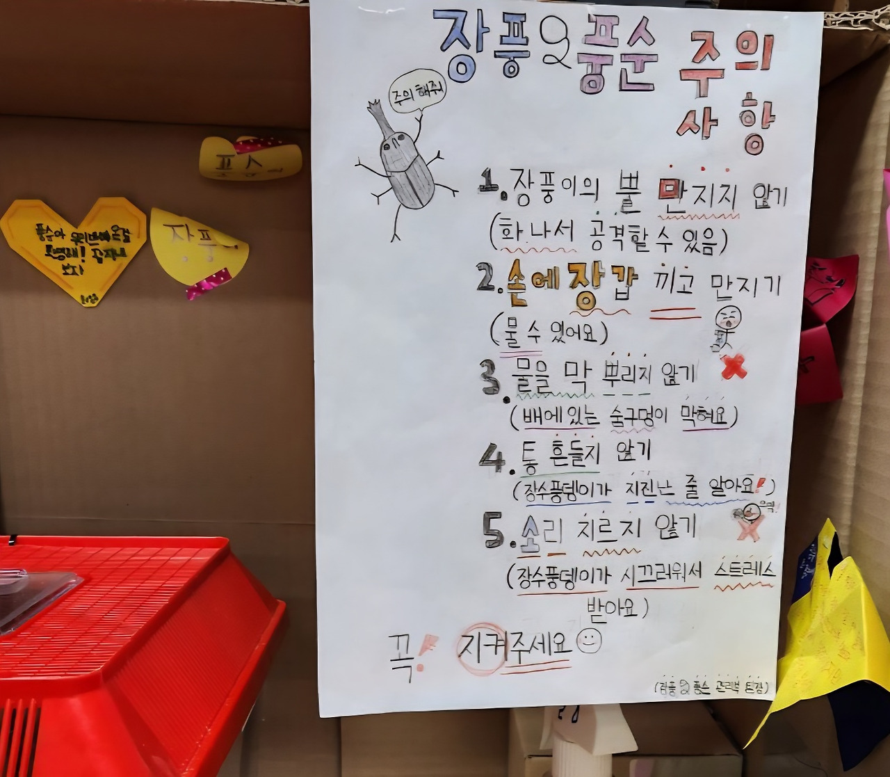 우리 반 어린이들은 장수풍뎅이 부부를 성대하게 맞이했다. 환영 인사를 담은 글과 그림 그린 쪽지를 사육 상자 주변에 여럿 붙였다. 이름도 지었다. 아직 부부는 아니지만 둘이 잘 사귀기를 바라며 수컷은 장풍이, 암컷은 풍순이로 지었다.