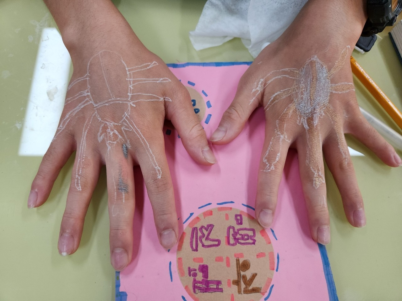장풍이가 죽은 날 아침이었다. 규연이가 내 팔뚝에 장풍이를 올려주었다. 이제는 기운이 떨어지고 힘이 없으니 괜찮을 거라고 했다. 친구들 팔을 따갑게 해 ‘아야야’ 소리 지르게 만들던 장풍이는 정말 기운이 없어 보였다. 다리로 꼬집지도 않고 가만히만 있었다. 팔을 기울이면 바닥으로 떨어질 듯 아무것도 쥐려 하지 않았다. 따갑지 않아서 좋을 줄 알았는데 그날따라 섭섭했다. 나도 '아야' 하며 깜짝 놀라고 싶었다. 그럴 수 있는 시간이 지났다는 건 이면지 글씨가 알려주고 있었다.