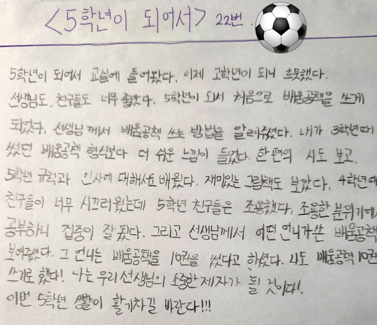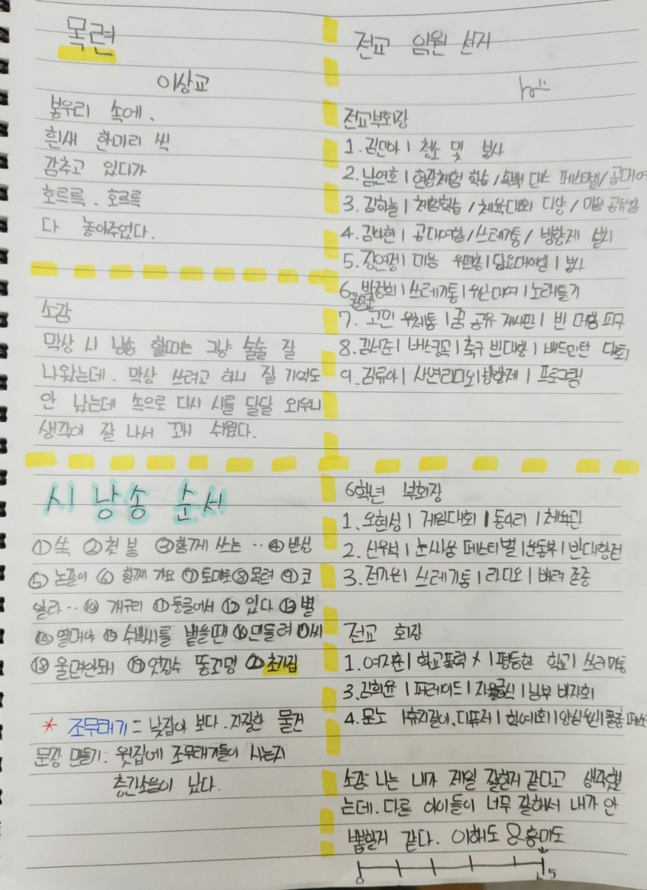 배움 공책은 거의 모든 교과시간에 썼다. 공부가 시작되면 어린이들은 교과서와 배움 공책을 동시에 폈다. 연필과 형광펜, 연필색연필도 같이 준비했다. 공책에 배운 시를 쓰고 외웠고 창체시간에 전교 임원 선거가 있으면 후보연설을 들으면서 중요한 걸 적었다.