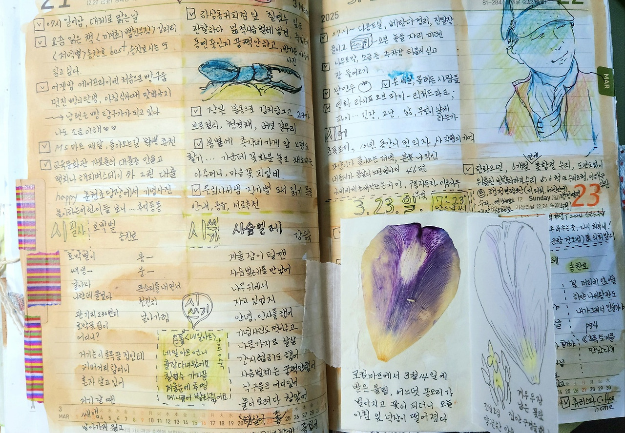 아침에 일어나면 일지를 펼친다. 오늘 할 일, 일어나서 방금 한 일을 적는다. 일지는 몇 달 사이 두툼해졌다. 써놓은 일지를 보면 지난 시간을 허투루 보낸 거 같지 않다. 공기 중에 흩어져 버릴 것만 같던 어제, 하루 사이에 희미해진 기억들이 공책에 적은 문장 속에서 의미 있는 일로 살아난다. 쓰는 순간 자잘한 일은 중요한 지위를 얻는다.