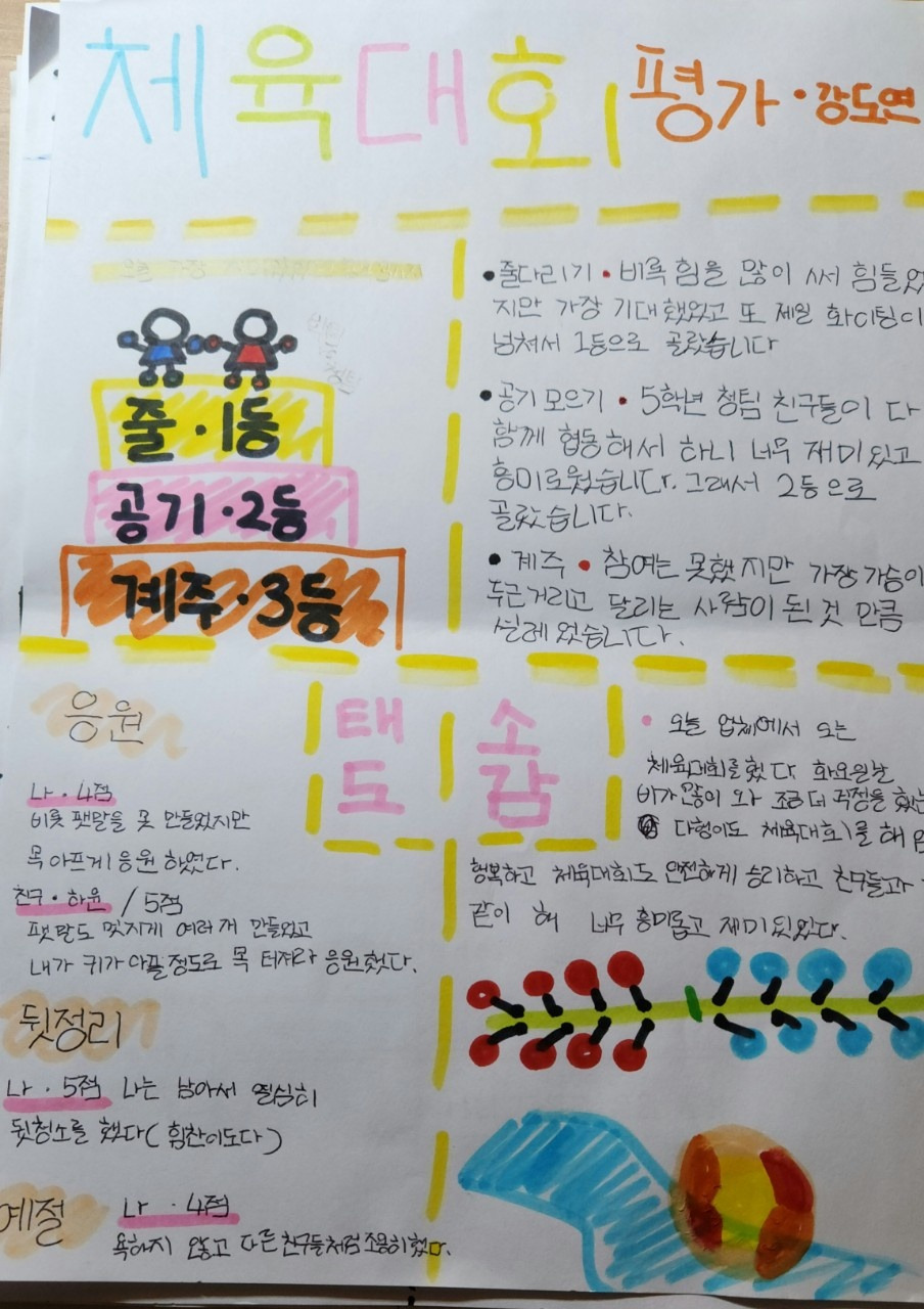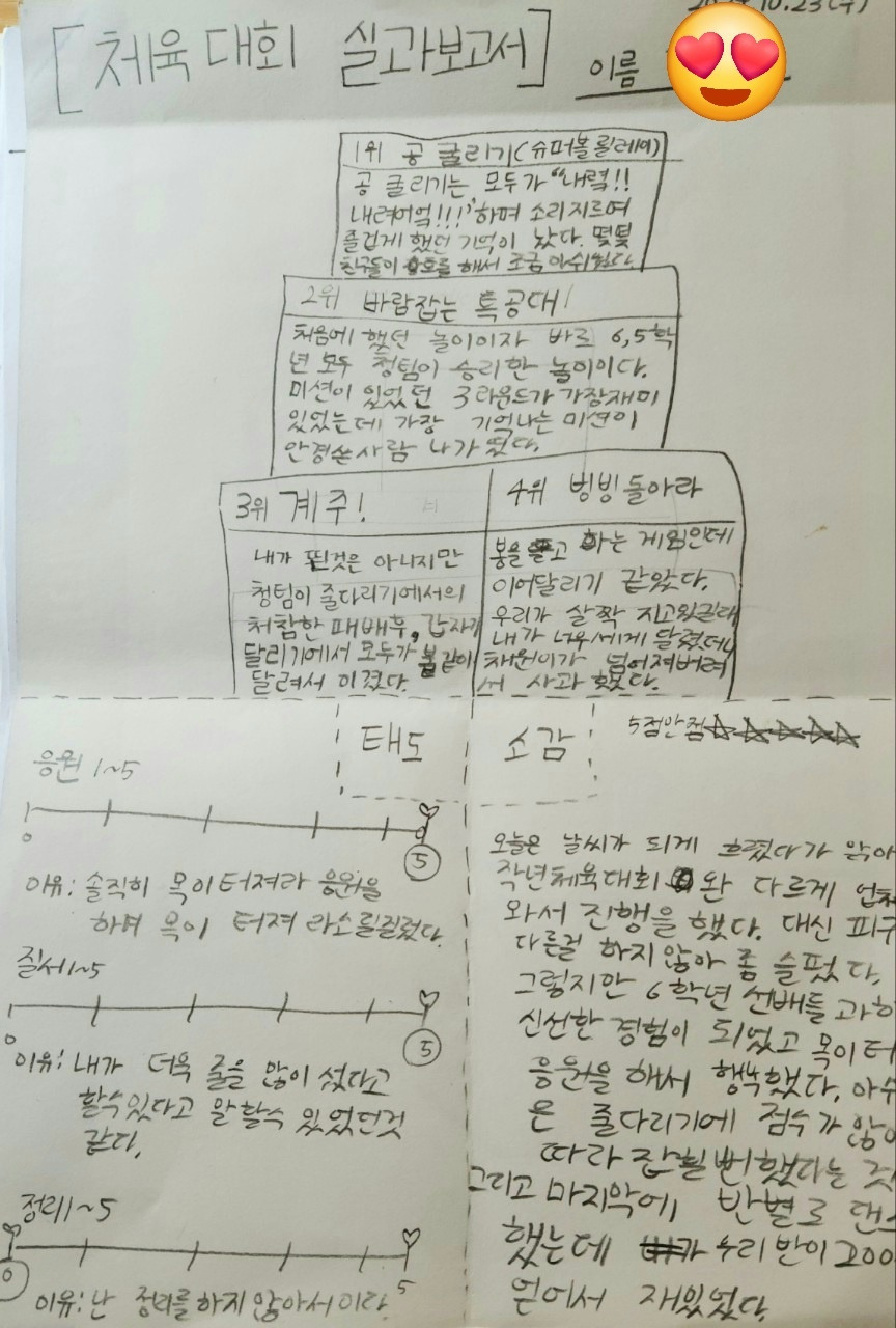 보통은 지나치고 말 일도 기록했다. 모둠발표를 하는 경우, 자기 모둠이 발표하고 나면 딴 척하는 어린이가 있기 마련이다. 이때 시상대를 그려놓고 긍정 평가 활동을 하면 집중력이 높아진다. 체육대회 같은 즐거운 행사를 마치고도 기록을 남긴다. 역시 시상대 형식의 도형을 그리고 즐거움과 재미 정도를 평가해 본다. 수직선을 그려서 태도를 평가하고 마지막으로 소감을 쓴다. 그런 뒤 짝토의를 하고 발표를 하고 나면 경험한 행사는 더 뜻깊게 남는다.