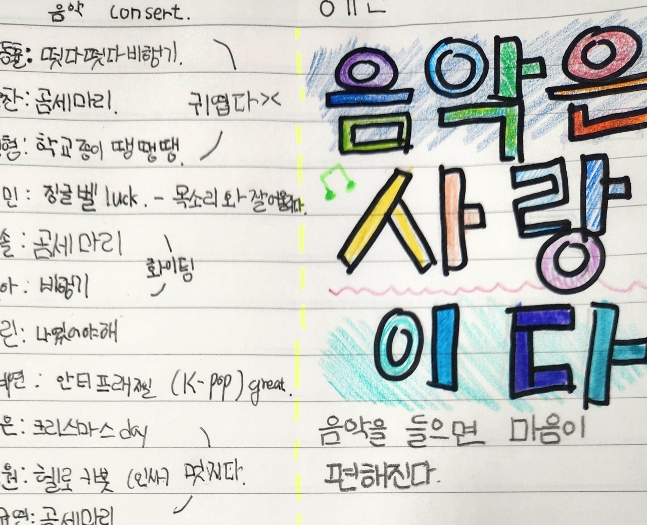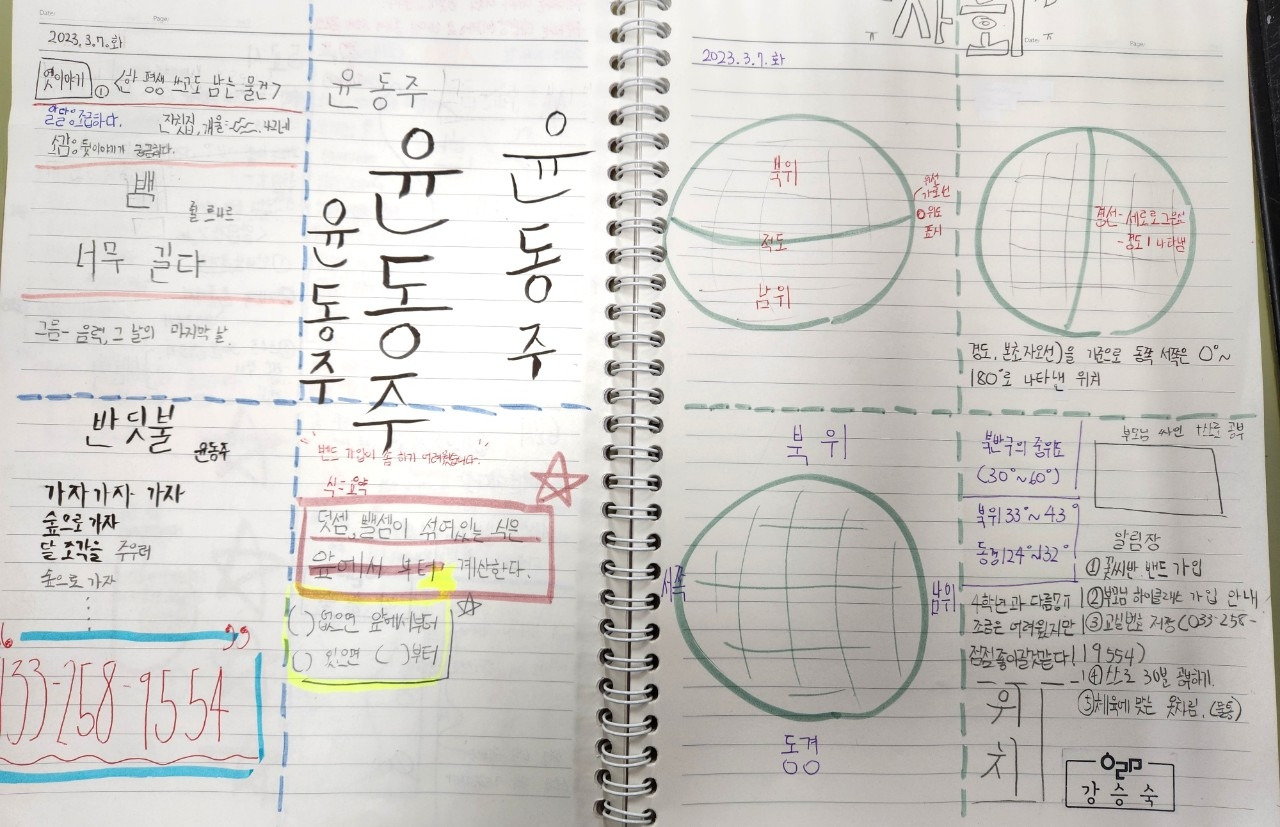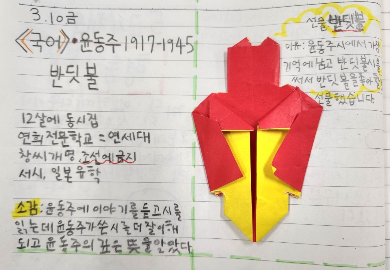 공책 정리의 즐거움을 더하기 위해 다른 재료도 썼다. 국어 시간, 윤동주 시를 배울 때에는 붓펜으로 윤동주 이름을 천천히 써보게 했다. 시인에게 감사의 마음을 전하기 위해 색종이로 선물을 만들어 공책에 붙이기도 했다. 공책은 단순히 배운 내용을 정리하고 요약하는 데서 그치는 게 아니라 느낌이나 감상을 예술적으로 표현하는 공간이기도 했다. '