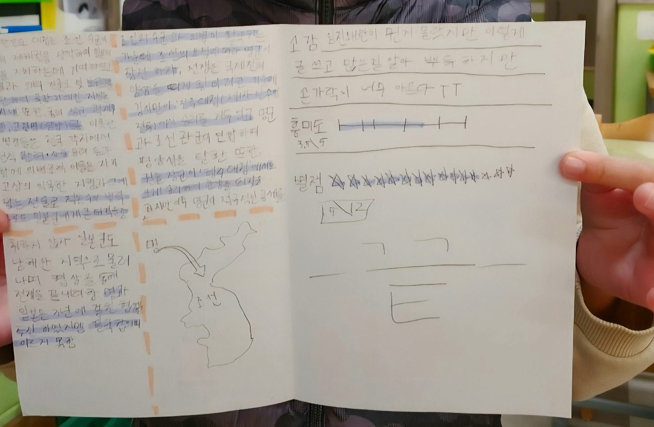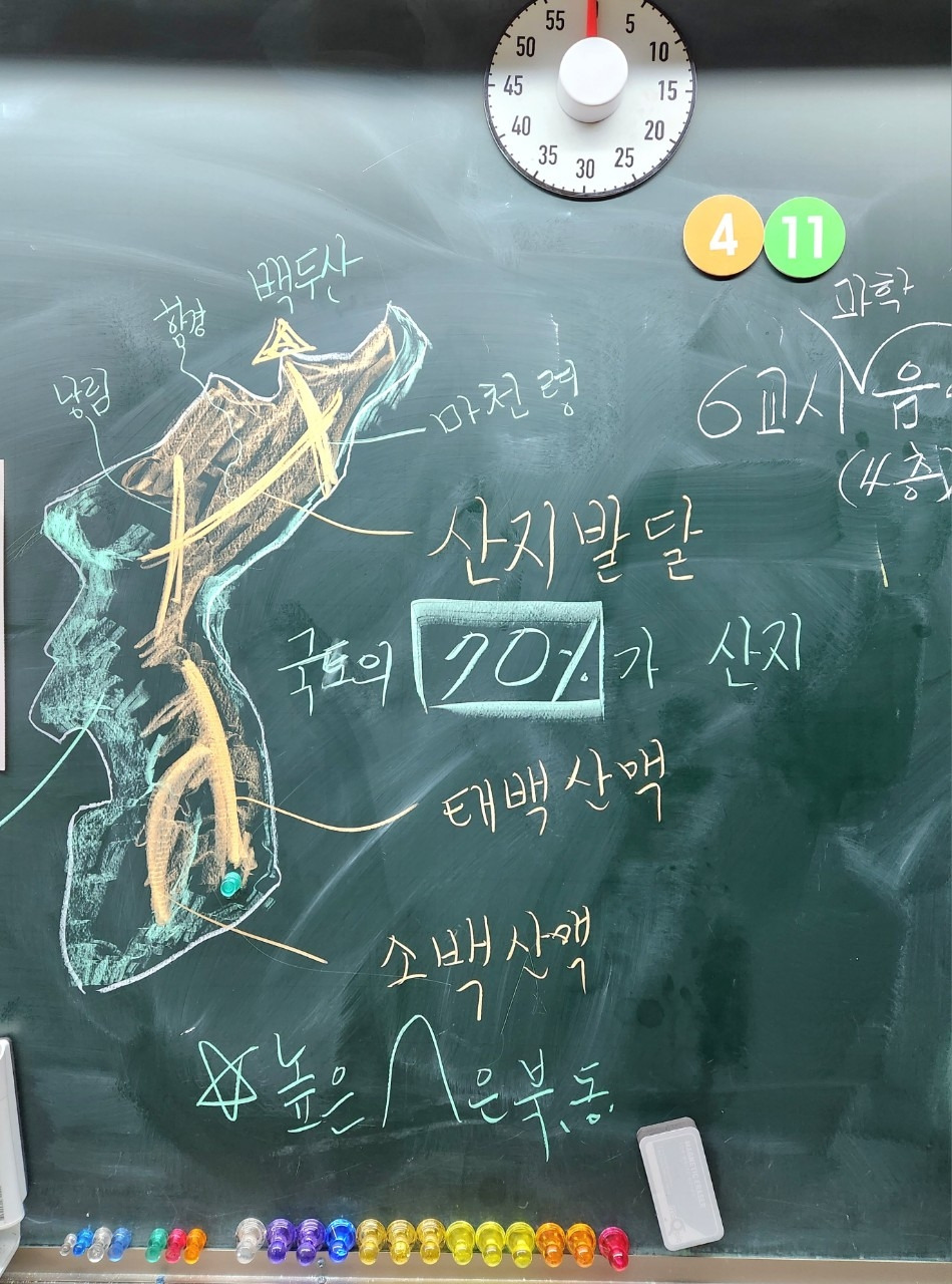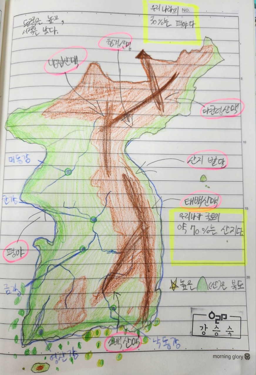 1학기에 배움 공책을 쓰면서 공부한 결과 2학기에는 훨씬 익숙해졌다. 무엇보다 어려운 역사를 배울 때 1학기에 부지런히 그려본 지도 공부가 도움이 되었다. 1학기 때에는 지도를 그리면서 우리나라 행정 지명과 주요 산맥과 강을 표시하고 외웠다. 시간마다 외우고 익혔다.