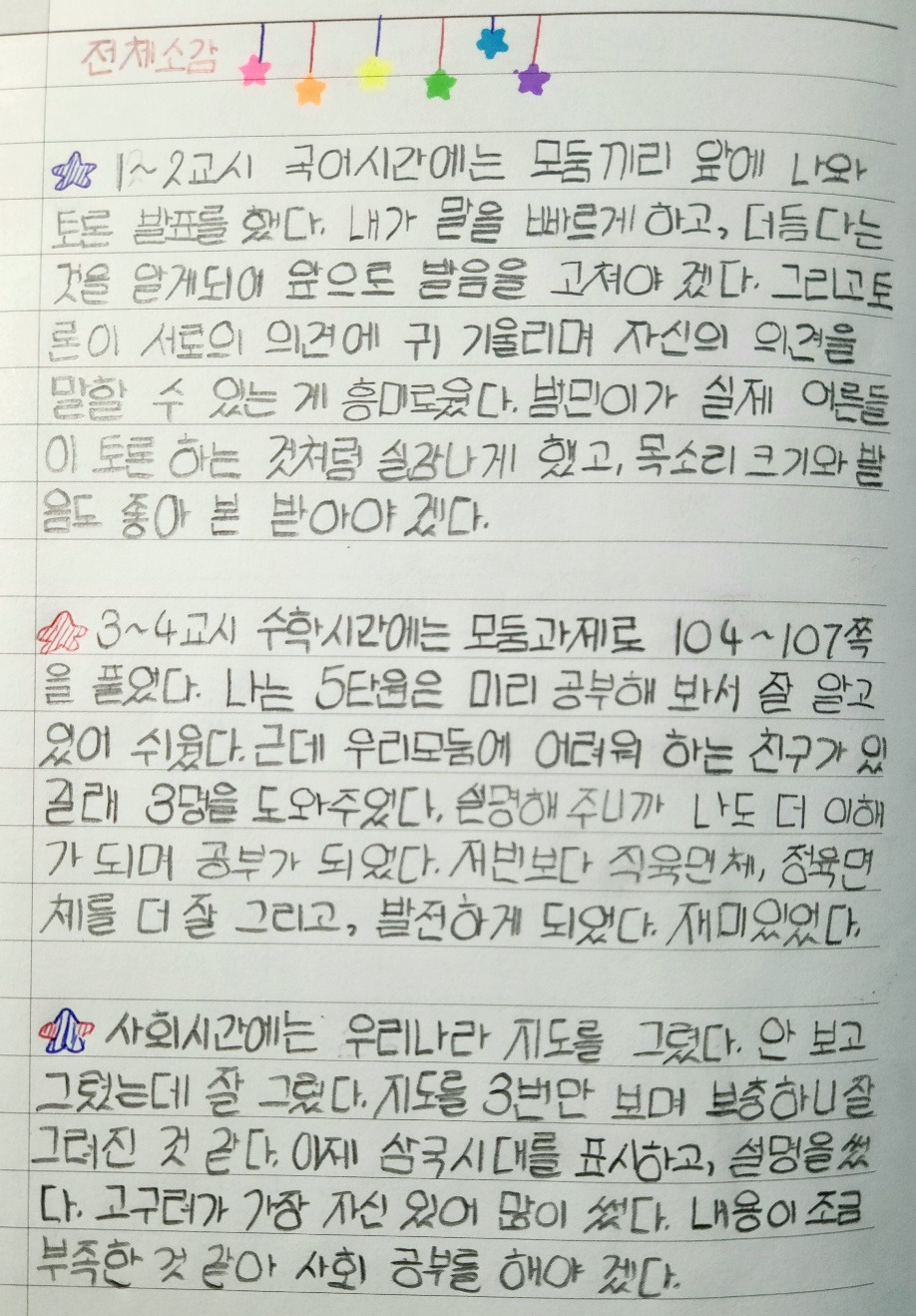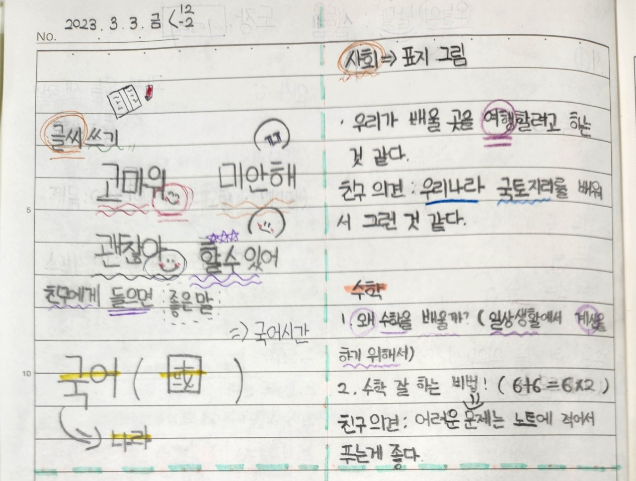 사회 시간, 난해한 위선과 경선을 배울 때에는 지구본을 공책에 직접 그리고 표시하게 했다. 교과서나 영상을 눈으로 보거나 읽는 데에서 그치지 않고 한번 읽은 내용을 공책에 다시 정리하게 했다. 공부시간이 끝날 즈음에는 공부한 소감도 썼다. 쉬는 시간에는 공책에 쓴 내용을 확인하고 도장을 쾅 찍어주었다.