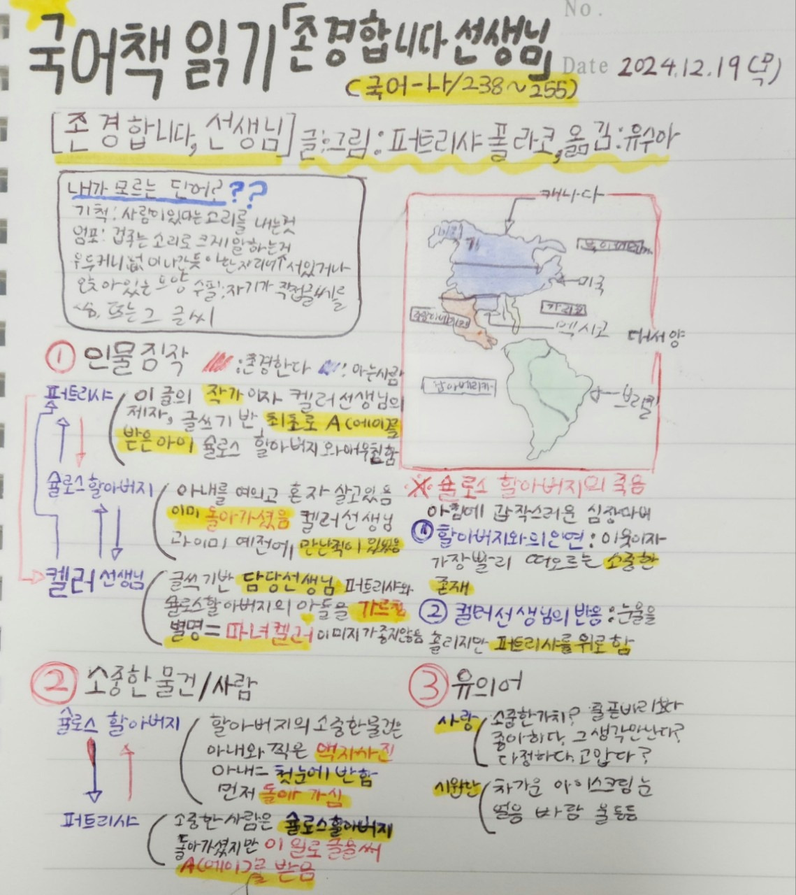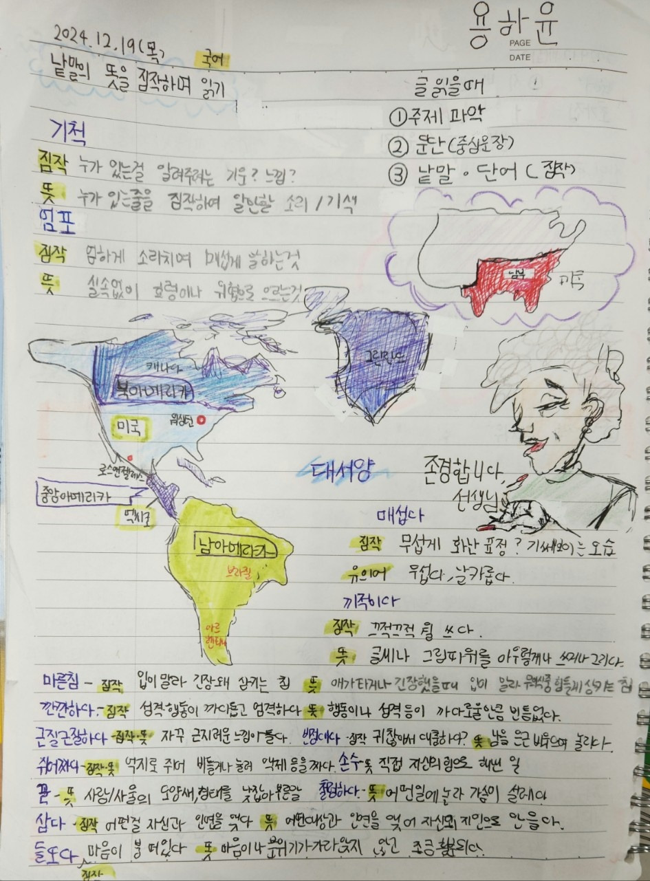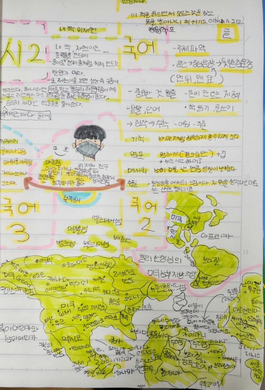 우리는 우리나라 지도뿐 아니라 이제는 세계지도 그리기에도 도전했다. 국어교과의 문학작품을 묵독하며 읽는 시간이었다. 그간 공부하고 배운 실력을 발휘하여 묵독하면서, 모둠 친구와 번갈아 읽으면서 공책정리하는 시간을 가졌다. 어린이들은 모르는 낱말의 뜻을 찾아 공책에 정리했다. 작품에 나오는 켈리선생님의 남부지방 억양을 이해하기 위해 아메리카지도를 그리고 지명을 찾아 표시했다. 어린이들은 무슨 흥이 났는지 그리지 않아도 되는 지명까지 그리고 표시했다.