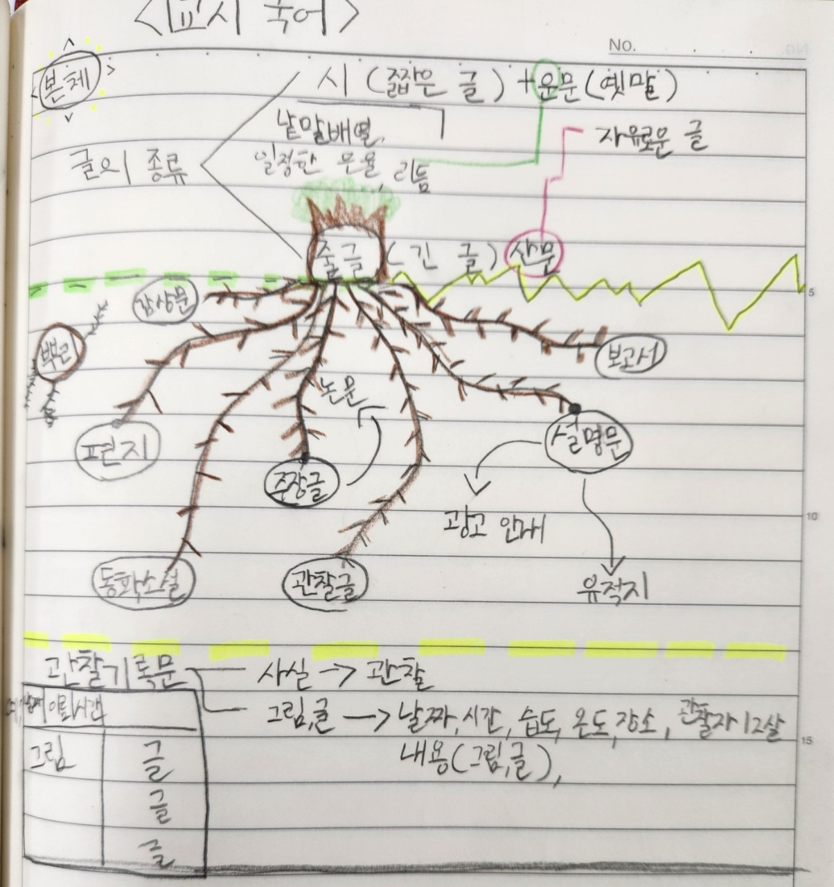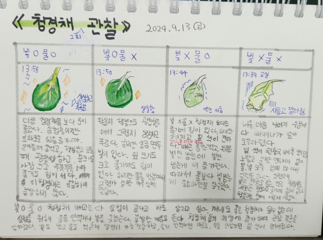 배움 공책을 쓰면서 칸을 나누고 글을 쓰고 표를 그리는 일에 익숙해진 어린이들은 관찰일기를 쓰거나 보고서 등 다른 형식의 글을 쓸 때에도 조금씩 힘을 발휘했다. 과학시간 관찰교과서에 청경채 관찰일지를 쓰는 활동이 있었다. 우리 반은 칸넓이가 좁은 실험관찰책 대신 자유노트에 관찰일기를 썼다. 직접 칸을 그리고 변화과정을 기록했다.