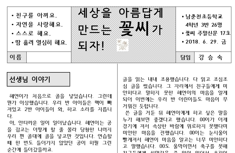 혜연이의 일기와 친구들의 위로 글을 주말신문에 실었다.