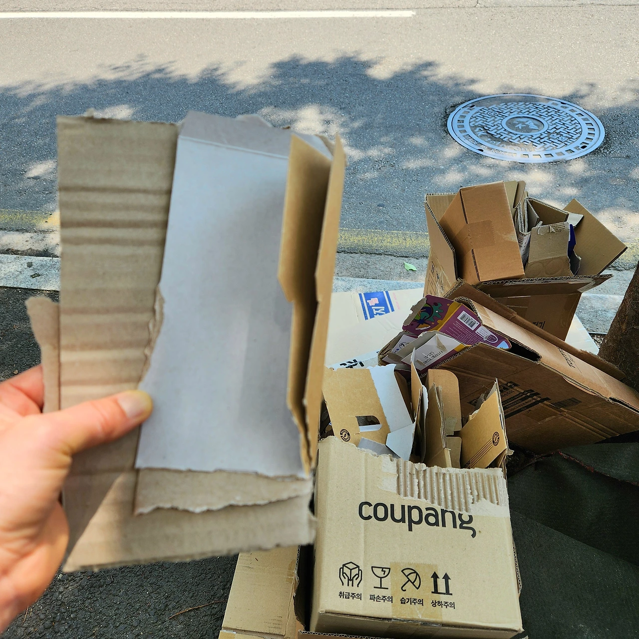 다행히 길가 가로수 옆에 박스가 있었다. 안도하는 마음에 쓸만한 상자를 찾아 상자 날개 한쪽을 북 찢었다. 찢은 박스 몇조각을 들고 서둘러 다리 밑으로 갔다.