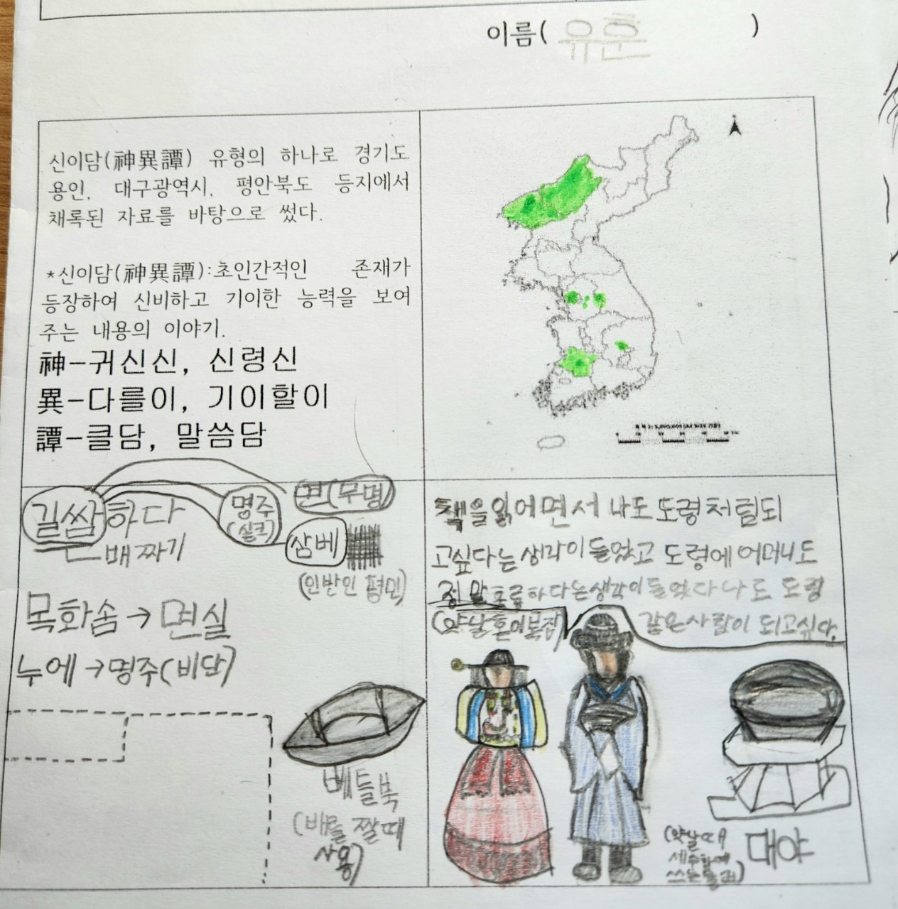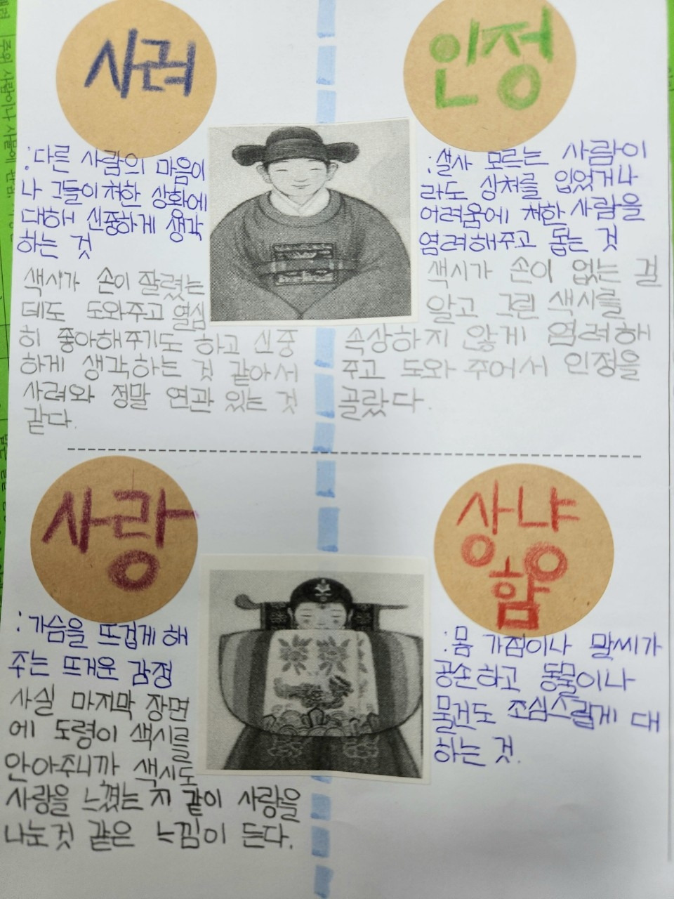 색시가 결혼할 때 입은 혼례복을 보면서는 색동에 대해서도 알아보았다. 색시가 손이 없지만 아기를 지키려고 애쓰며 스스로 베를 짜서 생계를 이어가려는 노력이 어떤 성장과 변화를 가져오는지도 알아보았다. 하지만 마고할미에 대한 공부는 조금 소홀했다. 그 점이 아쉽다.