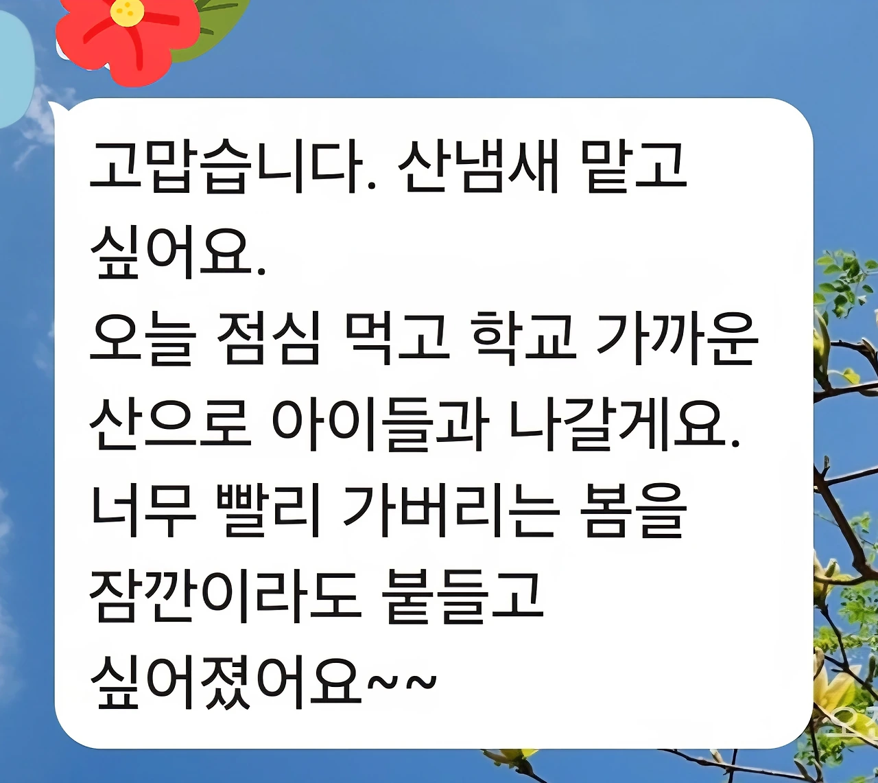 저마다 산 냄새를 갈망한다. 봄은 가는데 하루하루 무언가에 쫓기어 나들이 한번 못한다. 산 냄새 맡고 싶어요, 에서 그 마음을 알 거 같다. 하지만 시 배달이 오자 '산'이라는 시를 읽자 할 일의 우선순위가 흔들린다. 해야 할 일은 뒤로 가고 하고 싶은 일이 앞에 올 것이다. 지인은 곧 어린이들을 이끌고 나갈 것이다. 시가 힘을 발휘하는 순간이다.