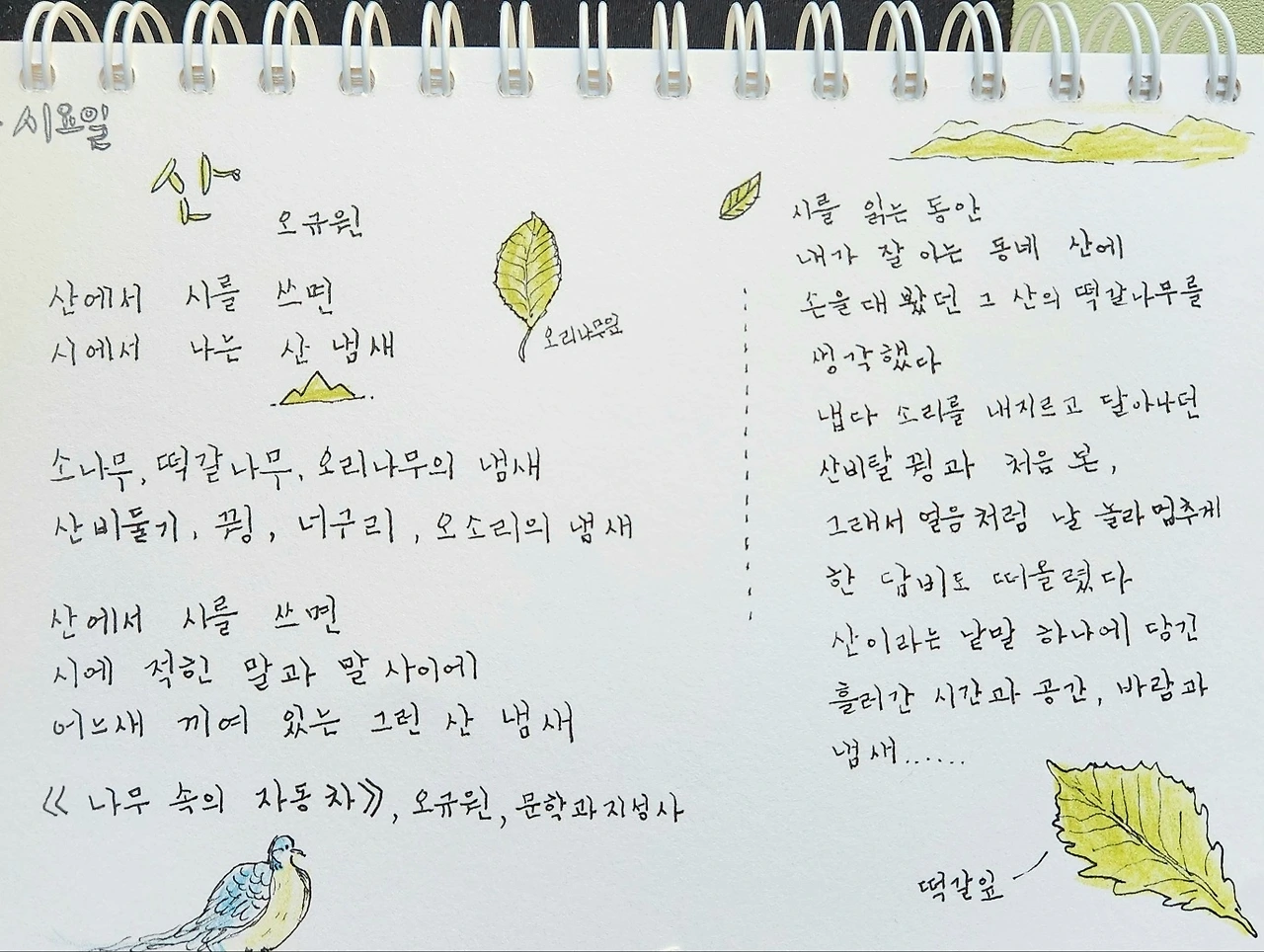 필사 한 시는 오규원 시인의 '산'이다. 시는 신선한 5월의 연둣빛과 어울린다. 시를 공책에 옮겨 적으며 중얼중얼 읽는다. 외우고 싶은 시다. 겨우 일곱 줄인데 산에 대한 추억을, 그리움을 넉넉히 담았다.