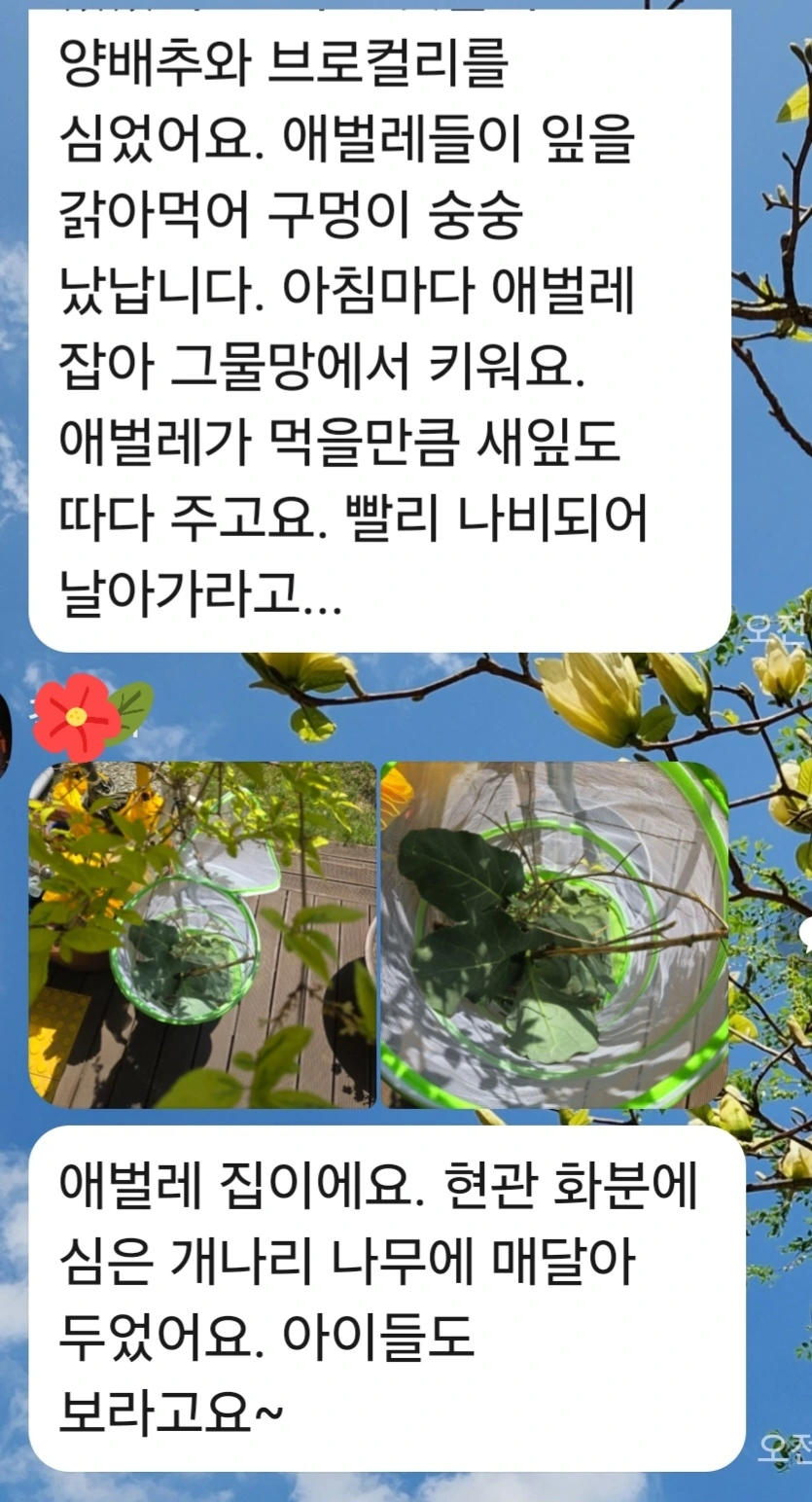 놀라운 소식이다. 양배추 먹는 애벌레를 잡아 그물망에서 밥 주며 키운다고 했다. 벌써 하얀 나비가 훨훨 날아가는 장면이 눈에 어른거린다.