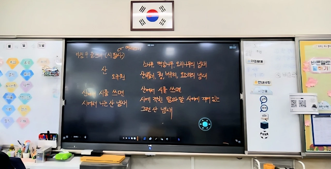 시를 받은 한 분은 그새 칠판에 시를 적고는 어린이들과 시 감상할 준비를 했다. `산`이라는 시가 교실로 들어가더니 칠판에 자리 잡았다. 보낸 시가 교실까지 이어졌다.