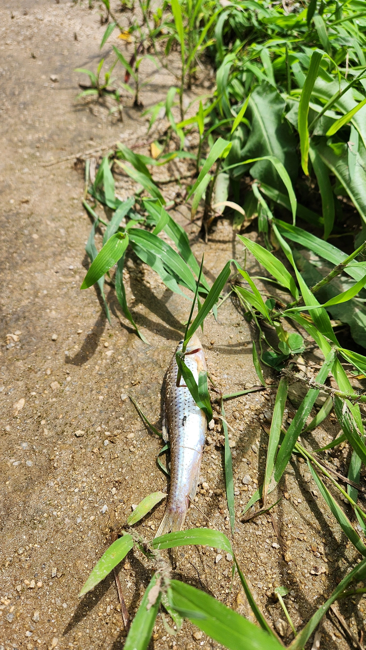 물고기의 죽음을 안타까워하고 있는데 남편이 손짓을 한다. 신발바닥만 한 물웅덩이에 빙어처럼 작은 물고기가 겨우 숨쉬고 있었다. 웅덩이 물은 한줌도 되지 않았다. 그 물마저 땡볕 아래서 곧 말라버릴 것이다.