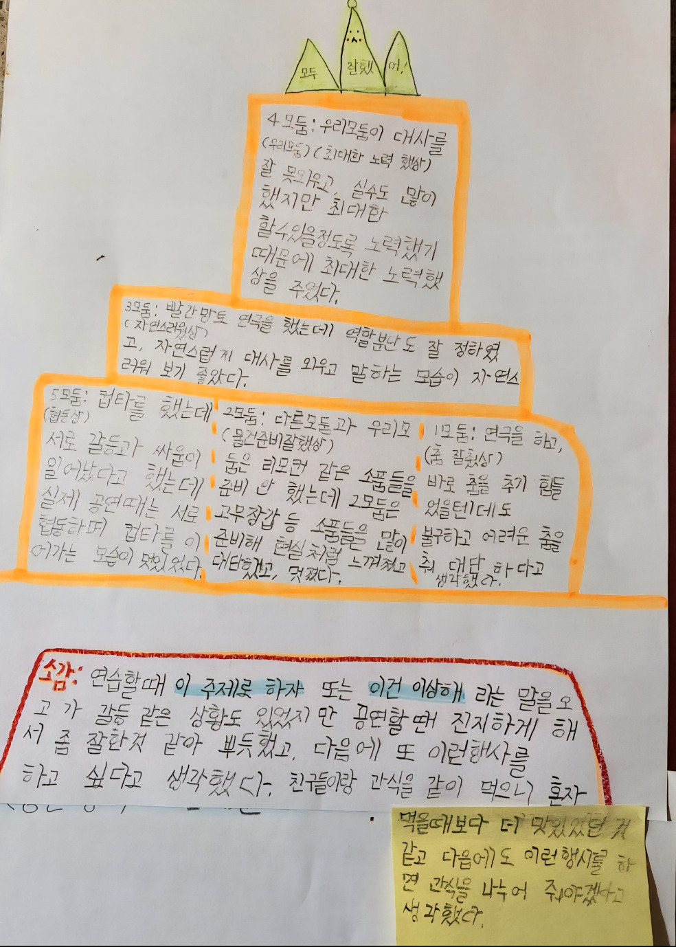 중요한 행사를 마치고 난 뒤에도 핵심어를 쓰고 짝토의를 한다. 특히 여러 날 준비하고 치른 행사는 어린이들이 그 일을 어떻게 준비하고 치렀는지 갈무리할 시간이 필요한다. 어린이날 공연 뒤 핵심어로 소감을 표현해 보았다.