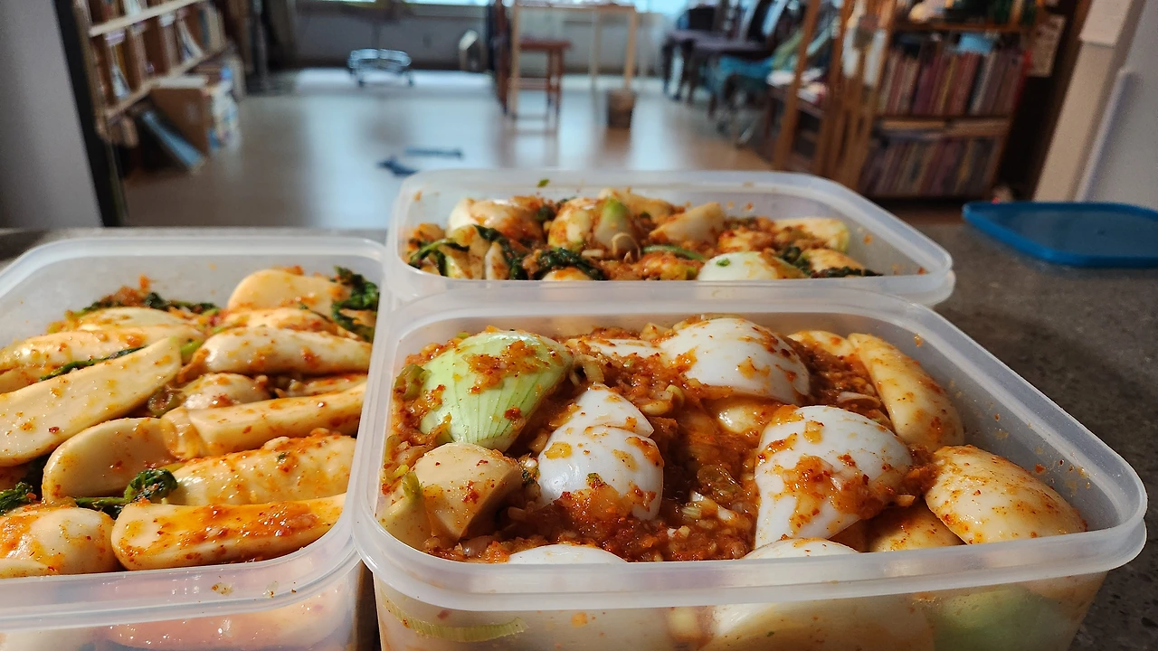 총각무가 싸게 나온 만큼 누런 무청이 꽤 있었다. 버릴 건 버리고 쓸만한 건 데칠 요량으로 따로 담아두었다. 총각무는 잘 다듬어서 씻은 뒤 소금옷을 입혔다. 몇 시간 뒤 잘 절여진 총각무를 씻어 김치를 담갔다. 양념조제는 남편이 잘한다. 나는 필요한 재료를 썰고 다졌다. 그렇게 준비한 재료를 총각무와 함께 큰 양푼에 넣어 버무렸다.